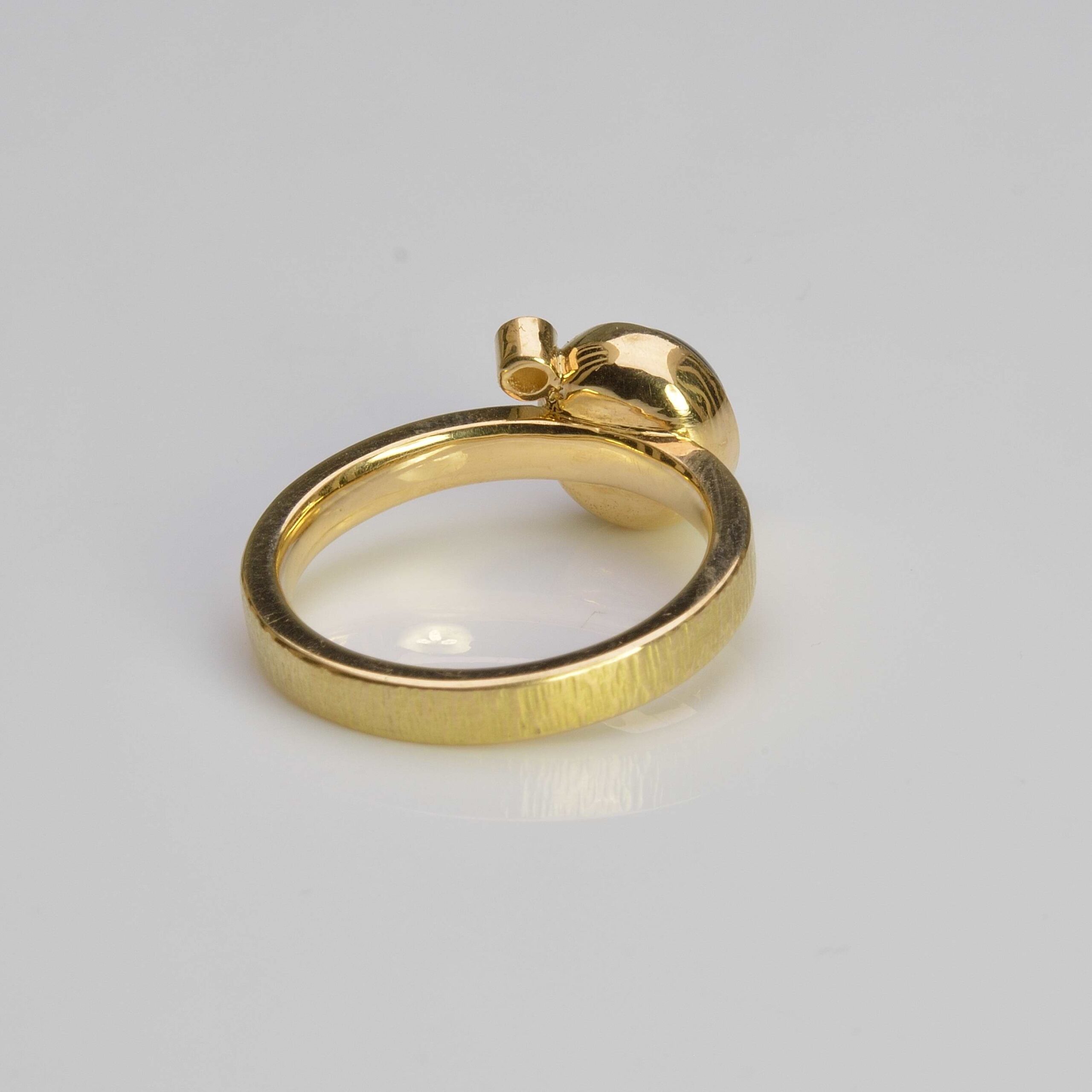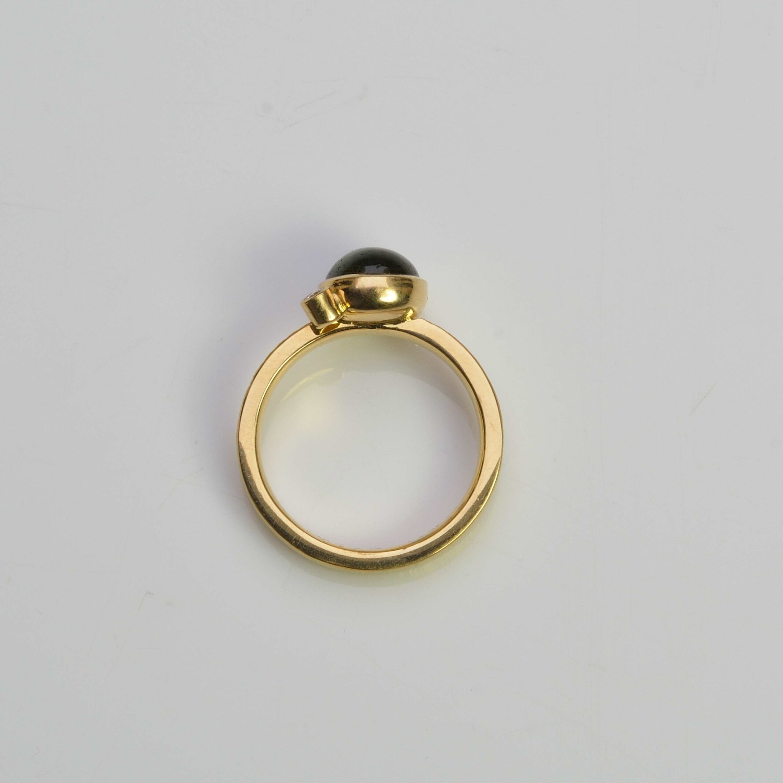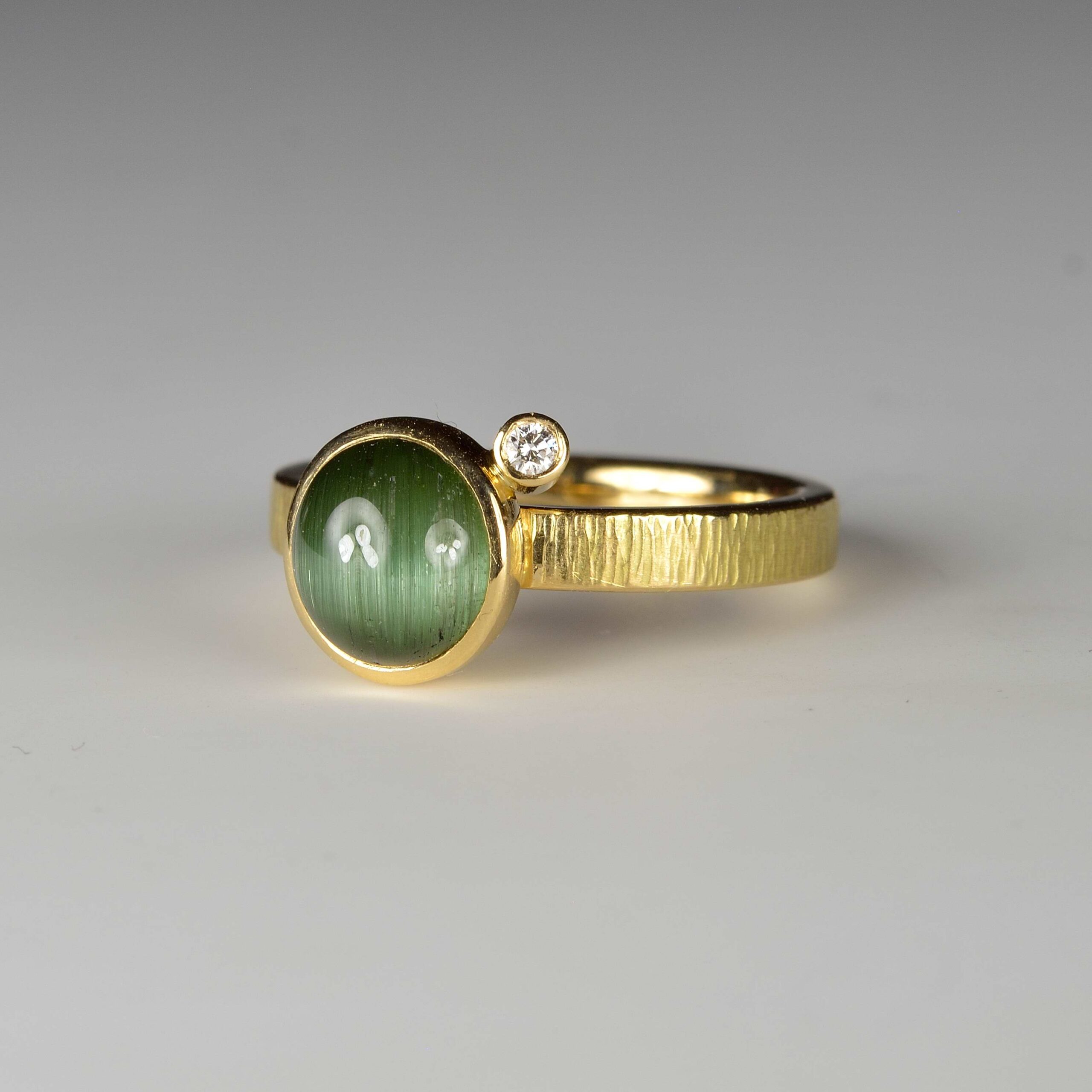 18ct yellow gold ring with a striking 8.5mm round cat’s eye green tourmaline cabochon and a partner 0.03ct natural brilliant cut round diamond. The ring shank has a hammered bark effect texture and measures 3mm wide and 2mm thick. Official Birmingham Assay hallmark.