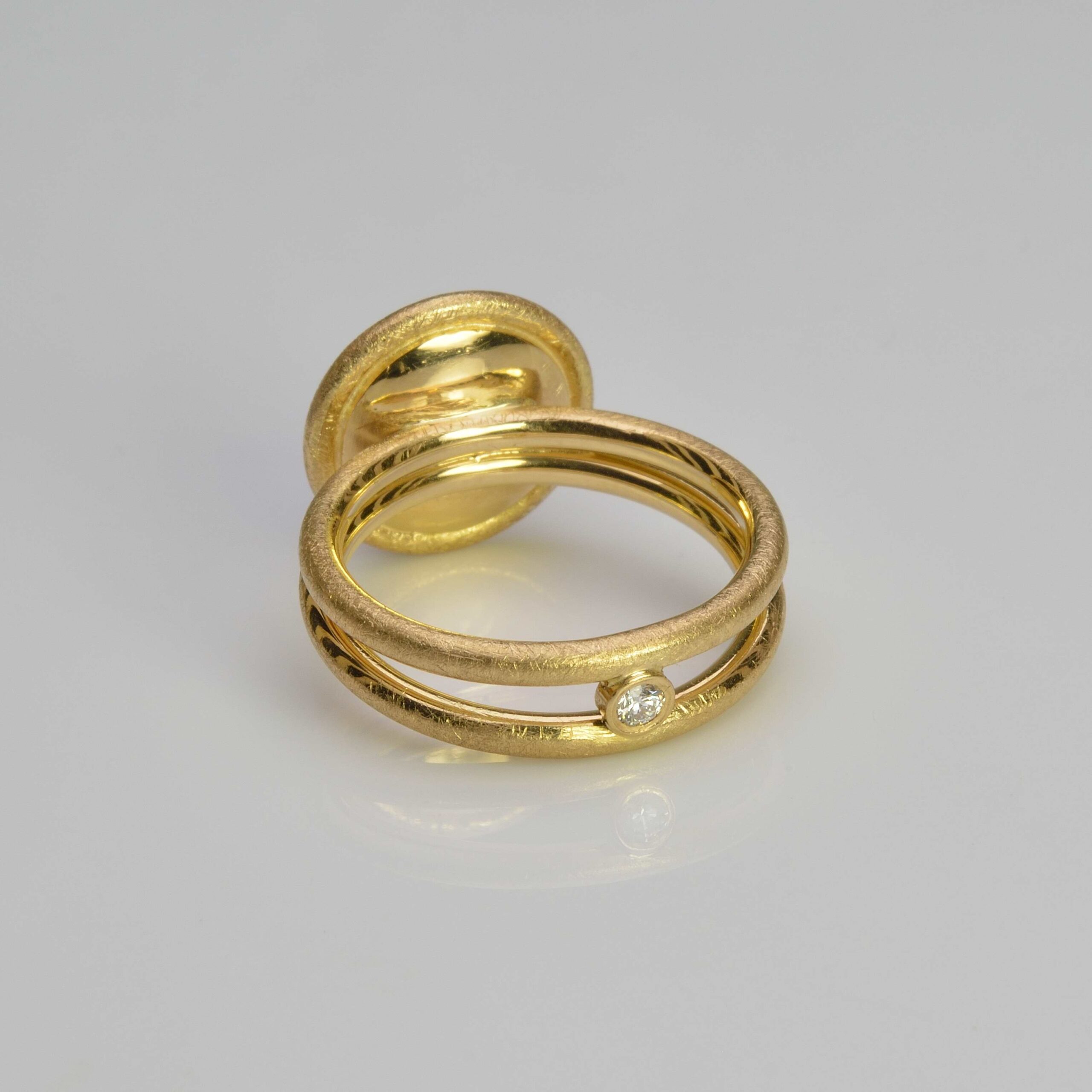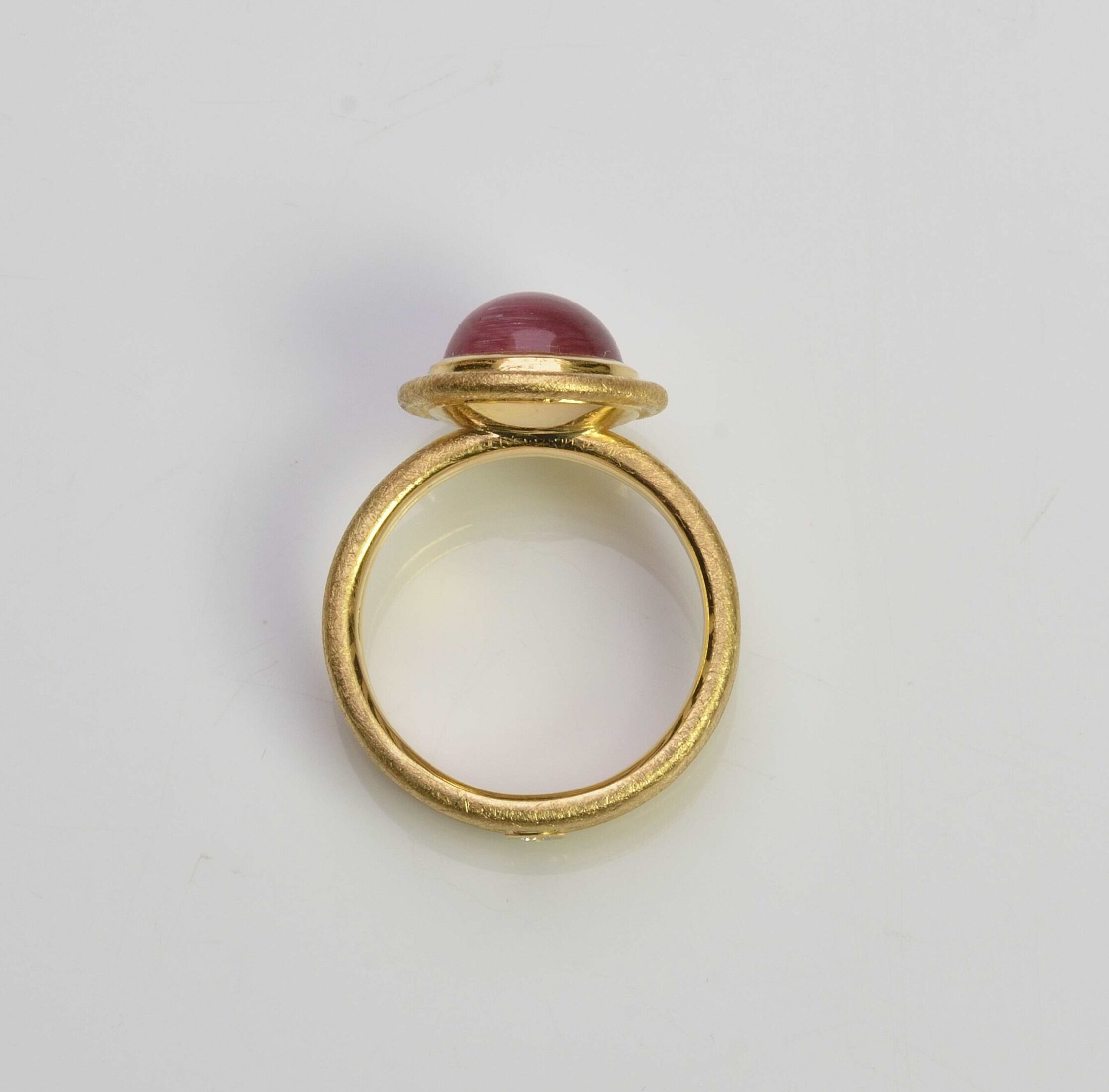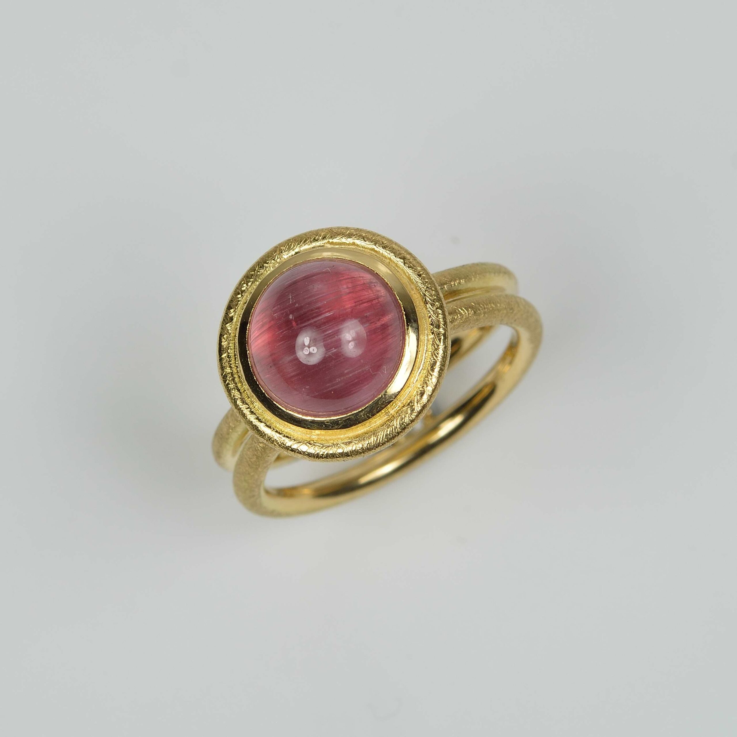 18ct yellow gold ring with a beautiful and seldom seen cat’s eye pink tourmaline cabochon, which measures 10mm in diameter.  Bezel set with a double, matt finished shank made from 1.9mm round wire.  The two rings are joined at the base with a setting holding a 0.05ct, 2.4mm round brilliant cut diamond.  Birmigham Assay hallmarked.