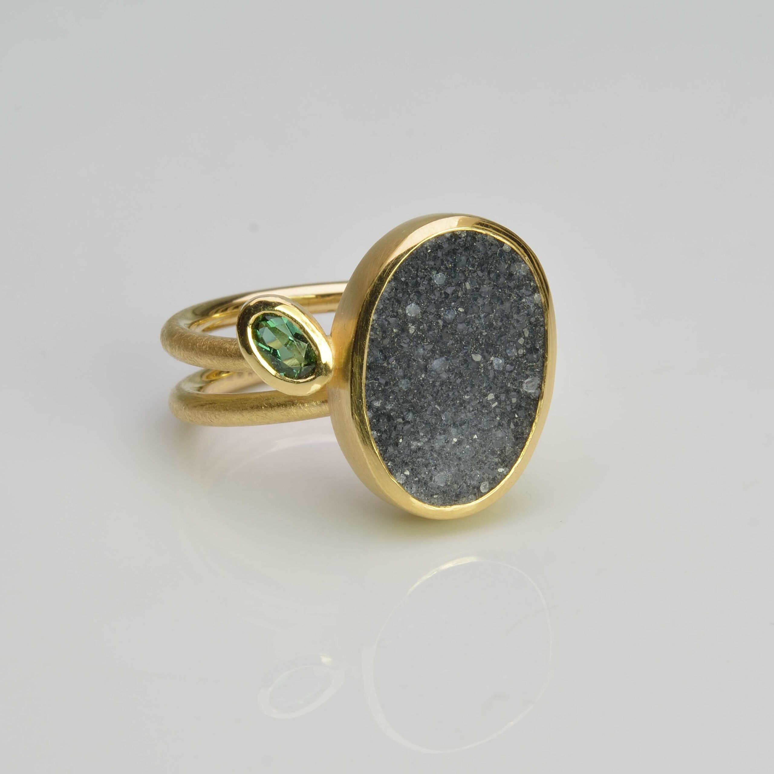 18ct yellow gold ring with a 17mm by 12mm oval crystillised agate drusy partnered with a green oval faceted tourmaline measuring 6mm by 3.5mm. Set onto a matt finish two band ring. Each round profile ring measures 2mm in diameter. With Birmingham Assay hallmark.