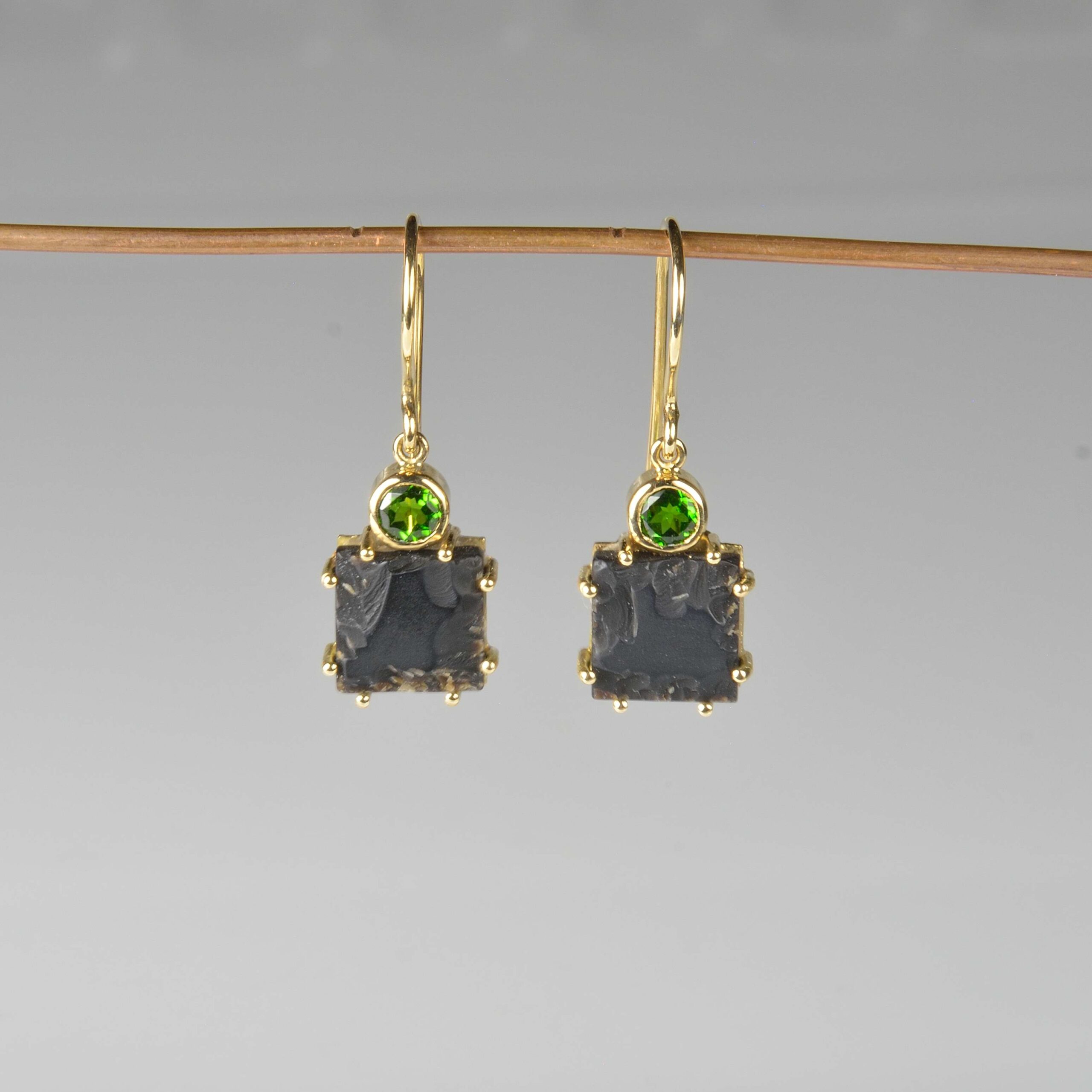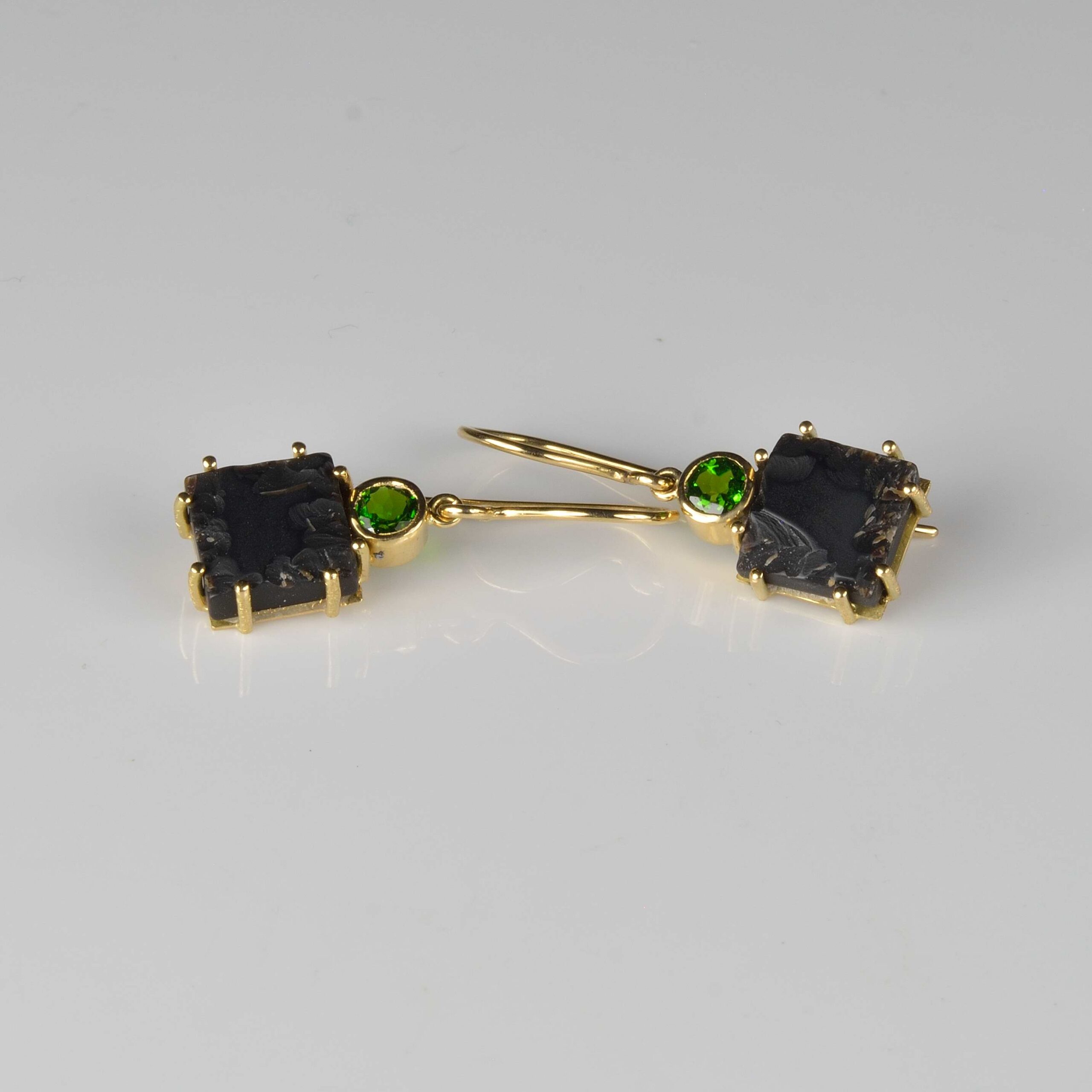 Uniquely cut square onyz, claw set in 18ct yellow gold with round faceted chrome diopside.  The onyz measures 9mm across and the chrome diopside are 4mm in diameter.  With an overall drop of 30mm.