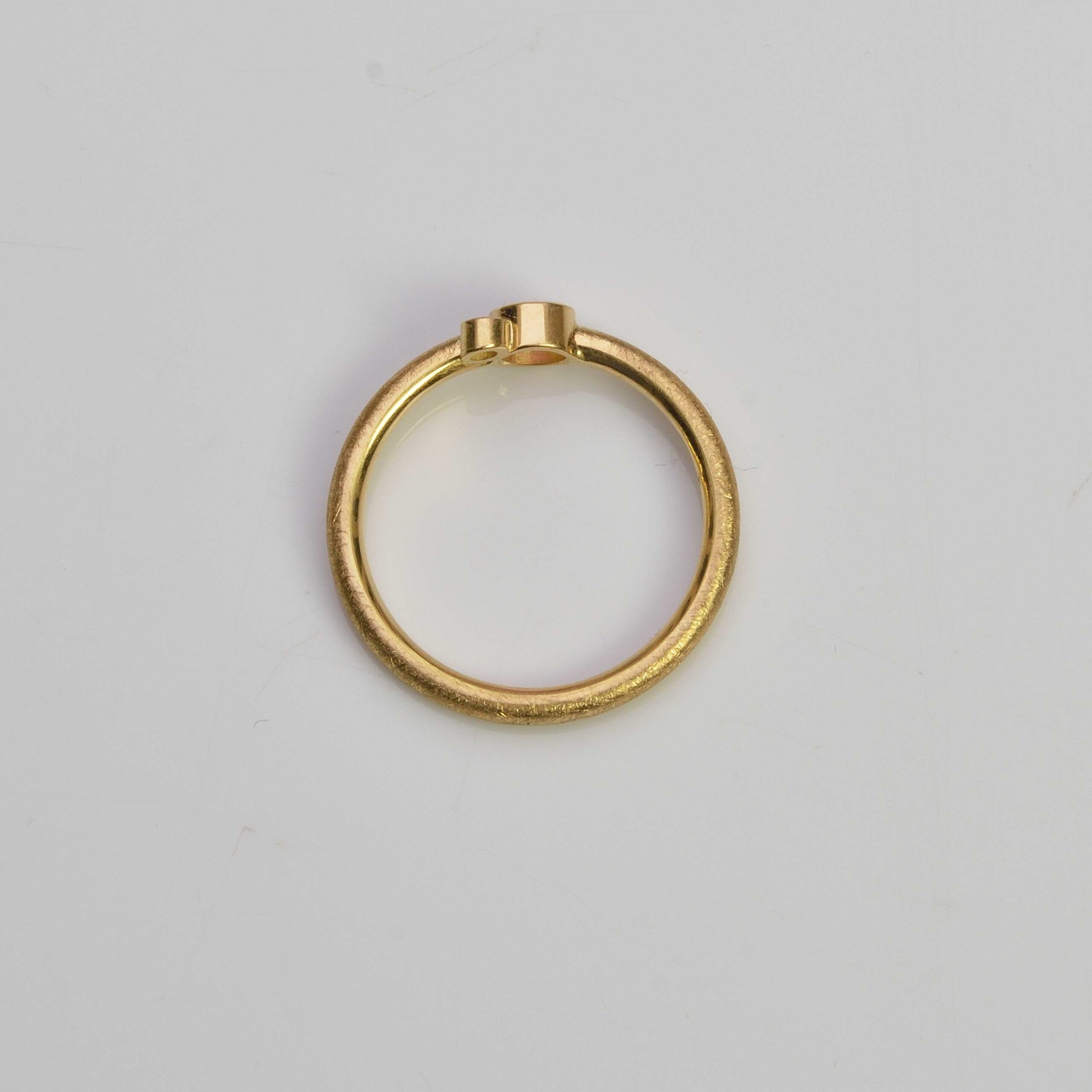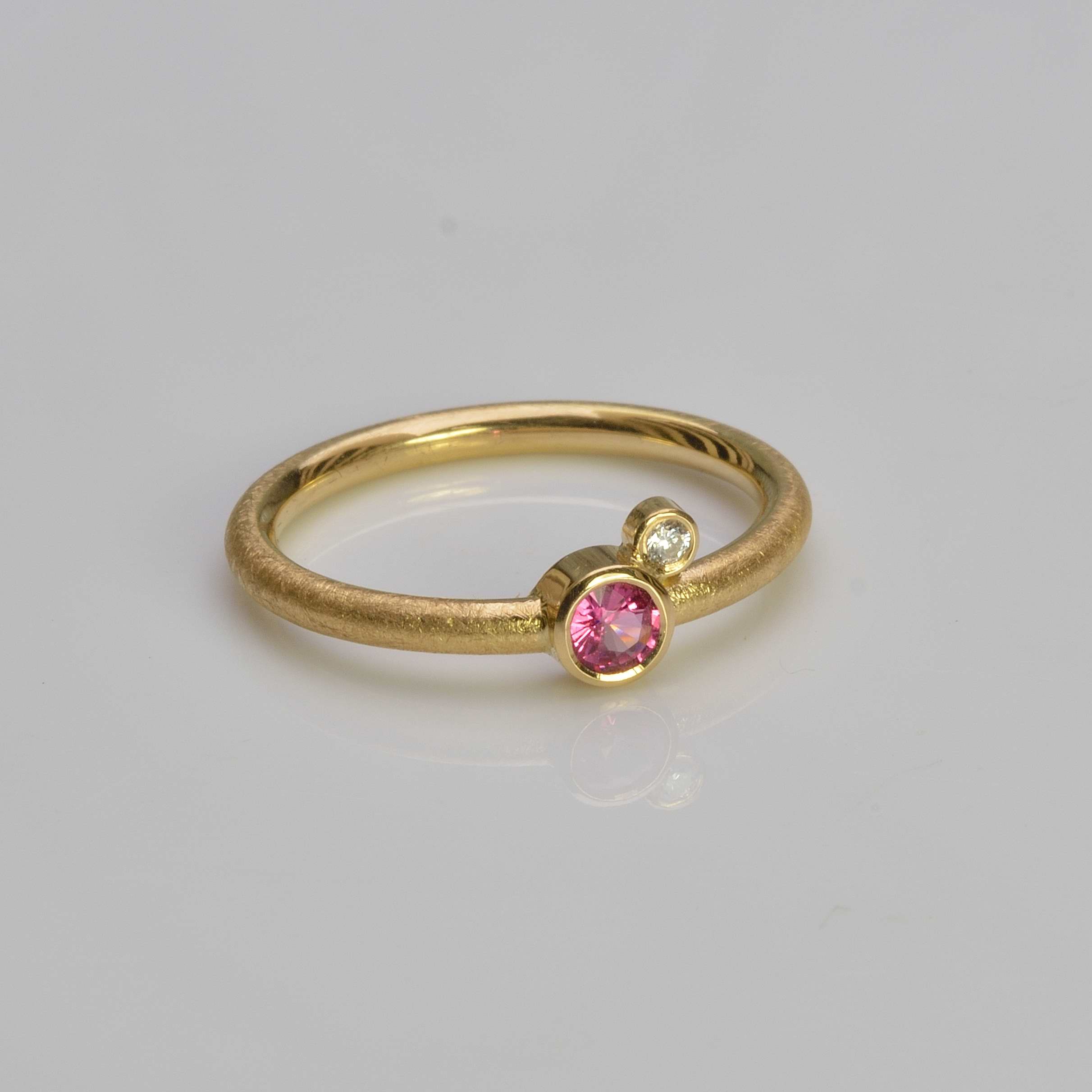 18ct yellow gold ring with a 3.5mm round faveted pink sapphire and a 1.9mm round brilliant cut natural diamond. Set into a matt finish round profile rink shank measuring 2mm in diameter. Hallmarked by the Birmingham Assay office.