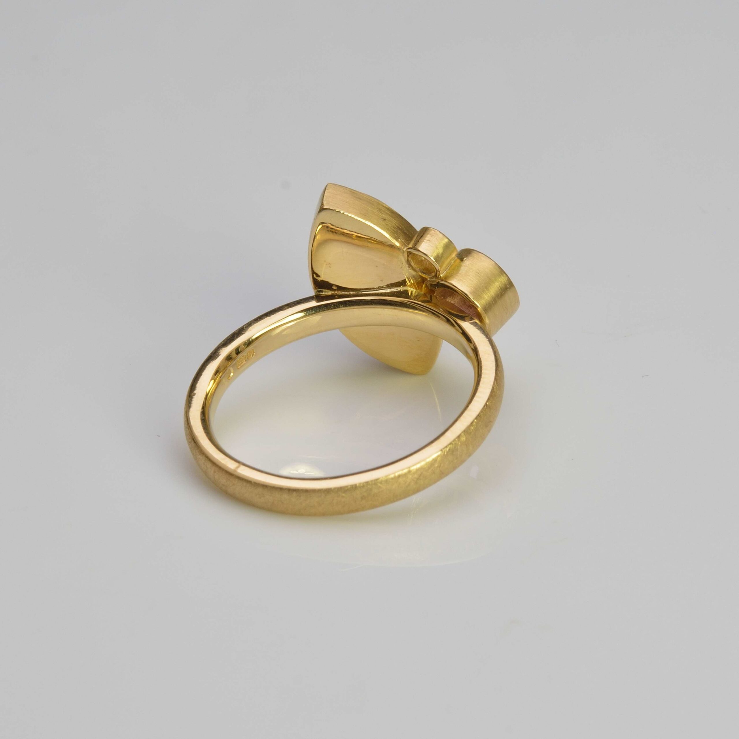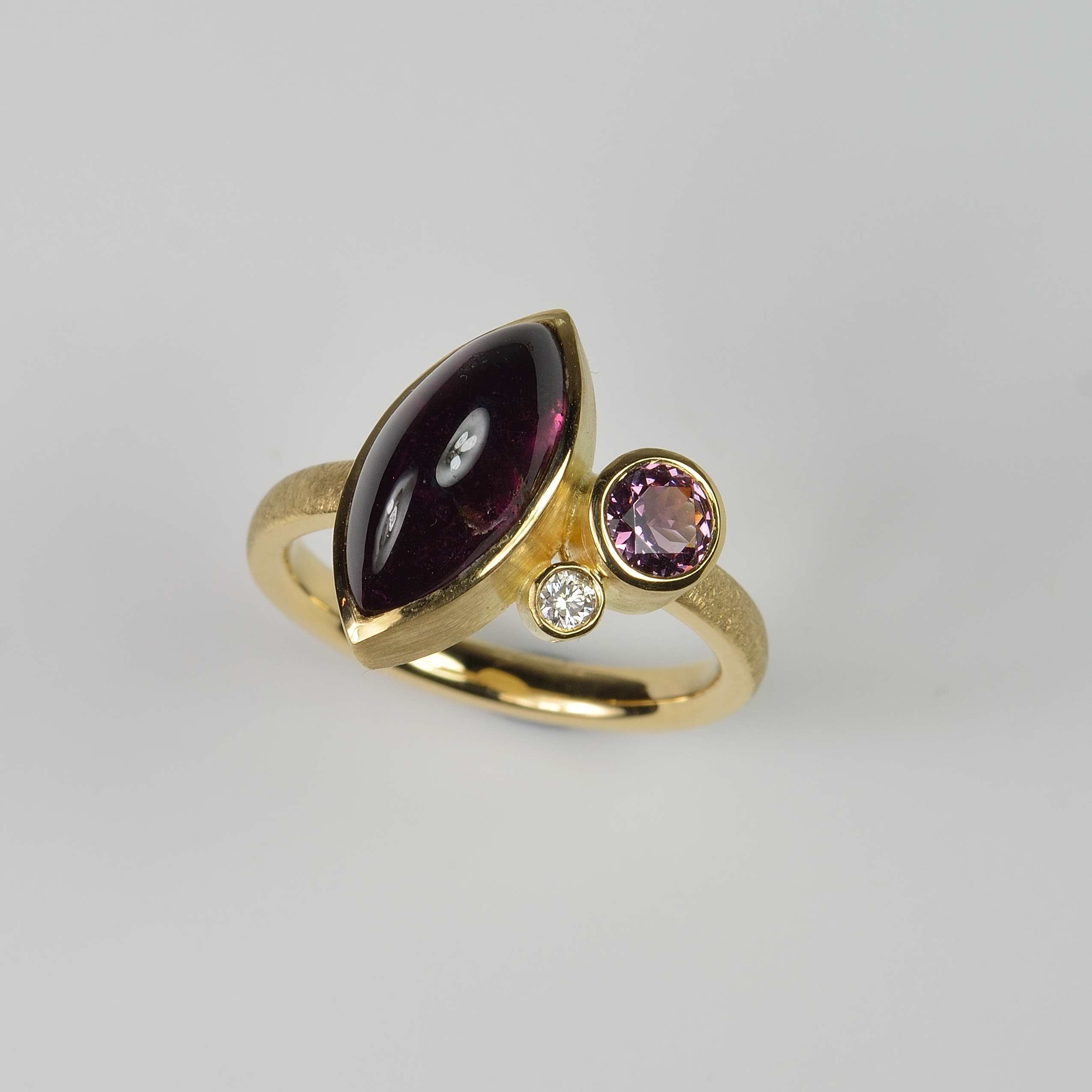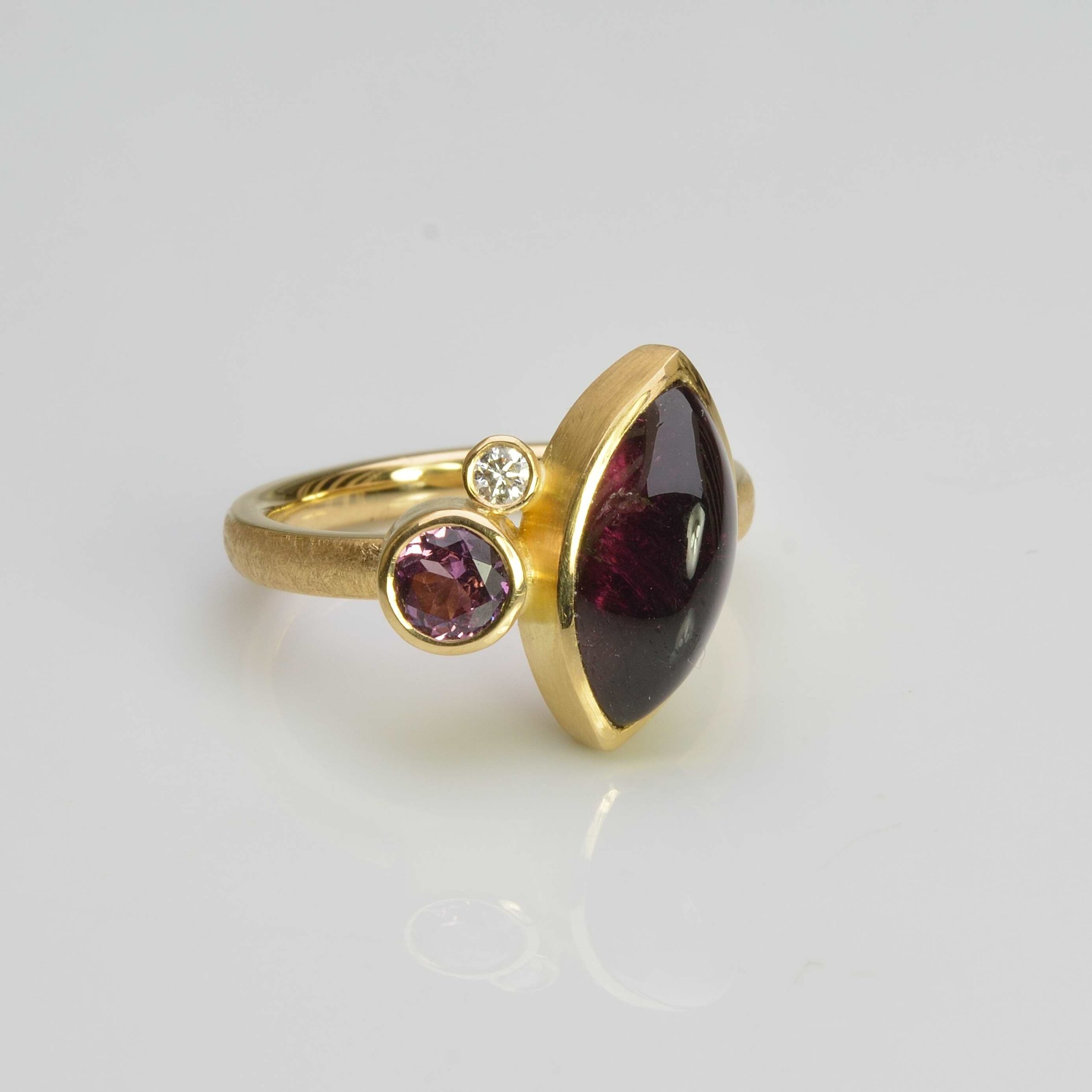 A pretty everyday dress ring, handmade in solid 18ct yellow gold combining a deep red navette tourmaline 14mm x 6.7mm cabochon with a 5mm round faceted pink rhodolite garnet and a 2.5mm round brilliant cut natural diamond (G/Si). The matt finish ring shank measures 2.6mm wide and 1.9mm thick. Official hallmark from the Birmingham Assay office.