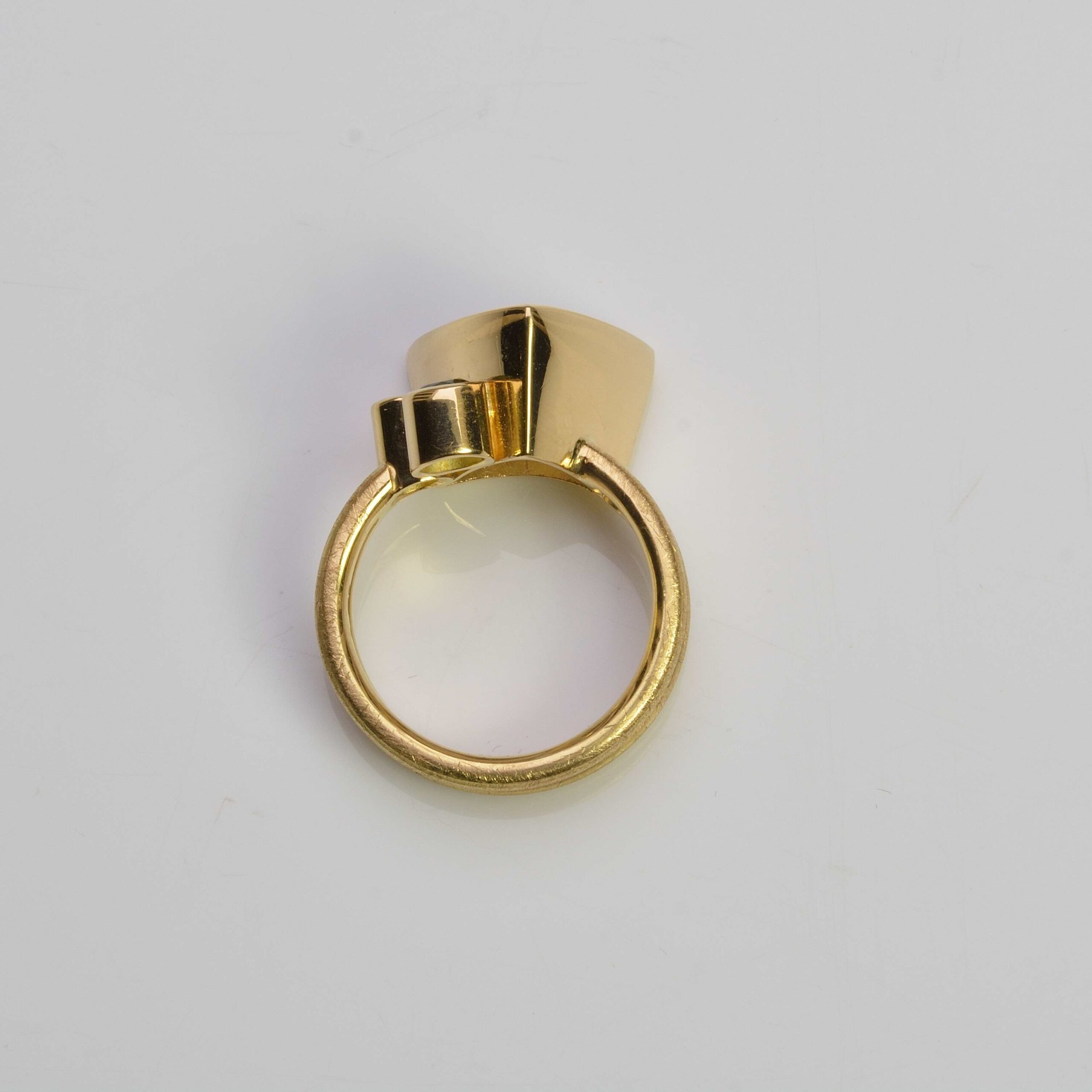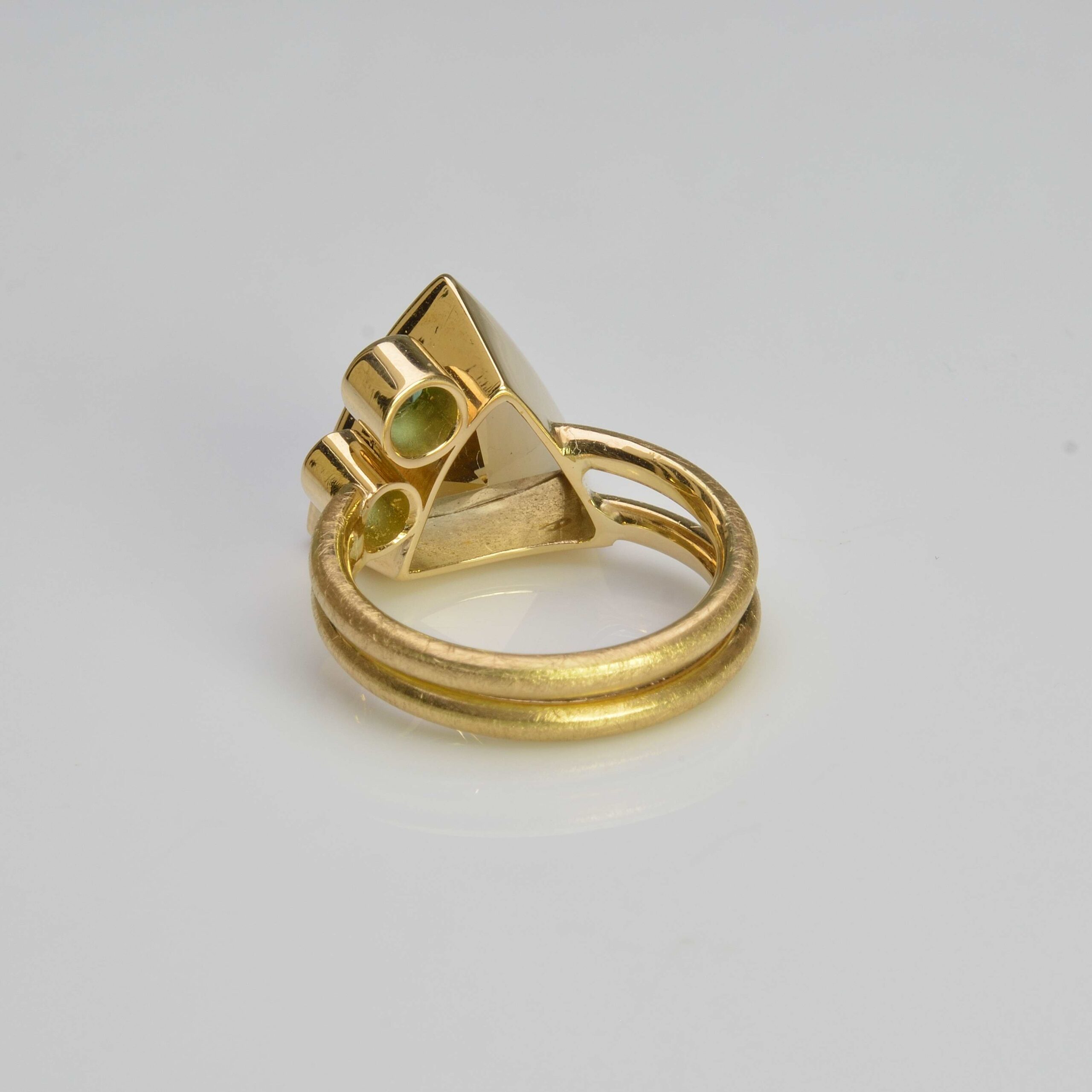 There is astonishing depth to the faceted trillion cut citrine, measuring 14mm. Paired with two deep blue green round faceted tourmalines, 4mm and 3.5mm in diameter. Handmade in solid 18ct yellow gold with official Birmingham Assay hallmark. Another one-off piece.