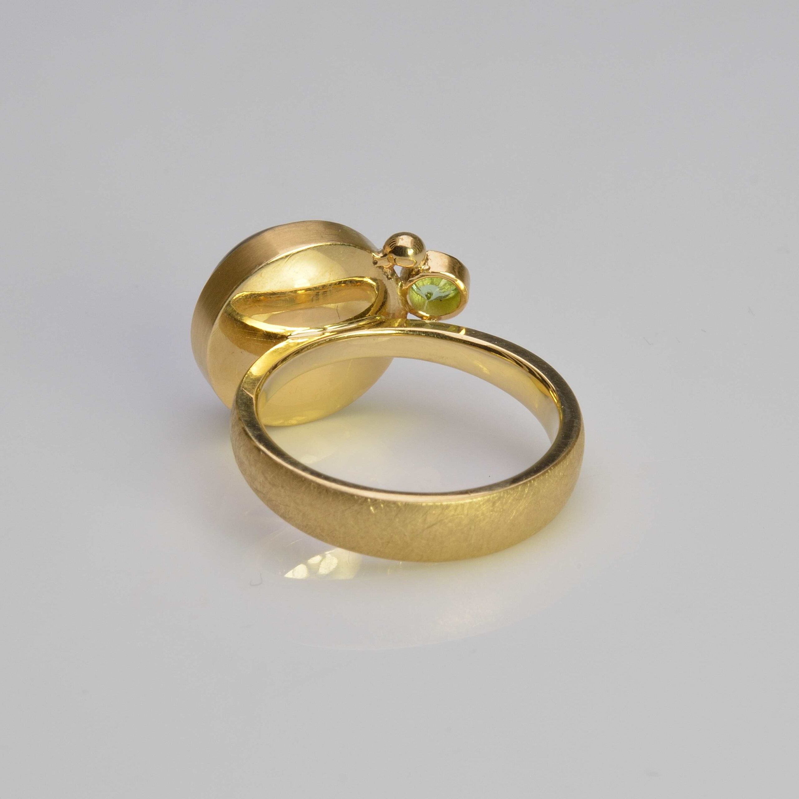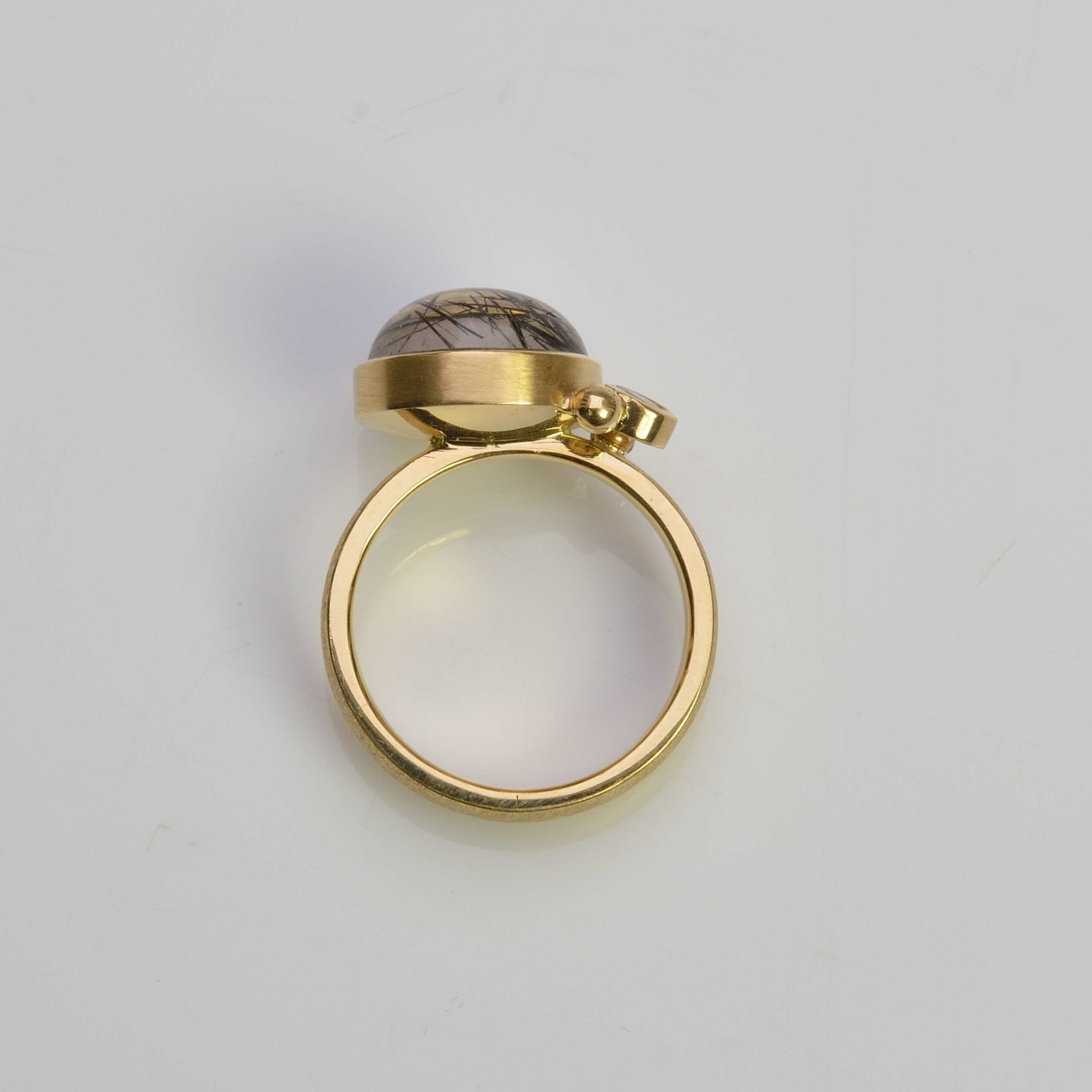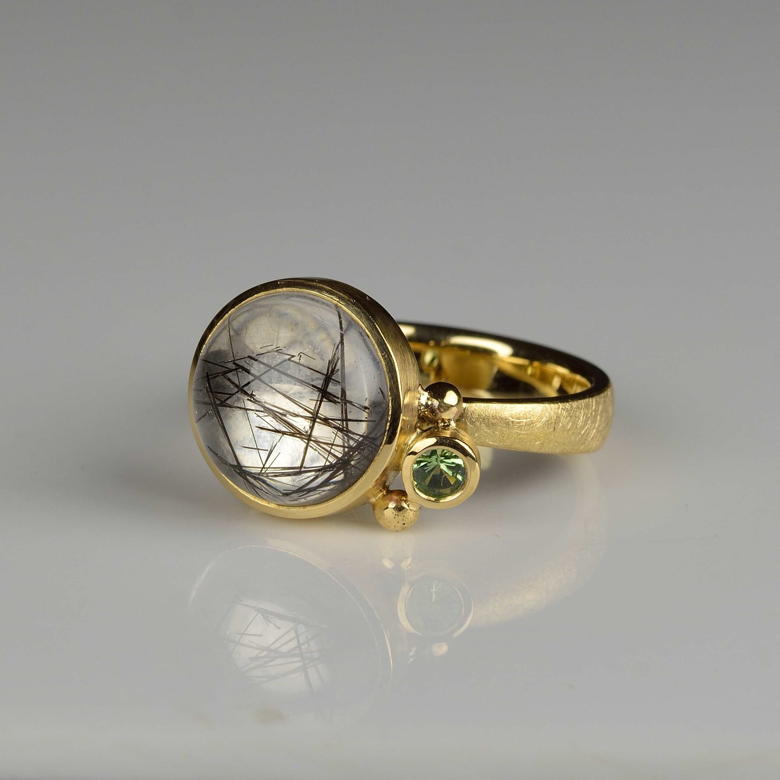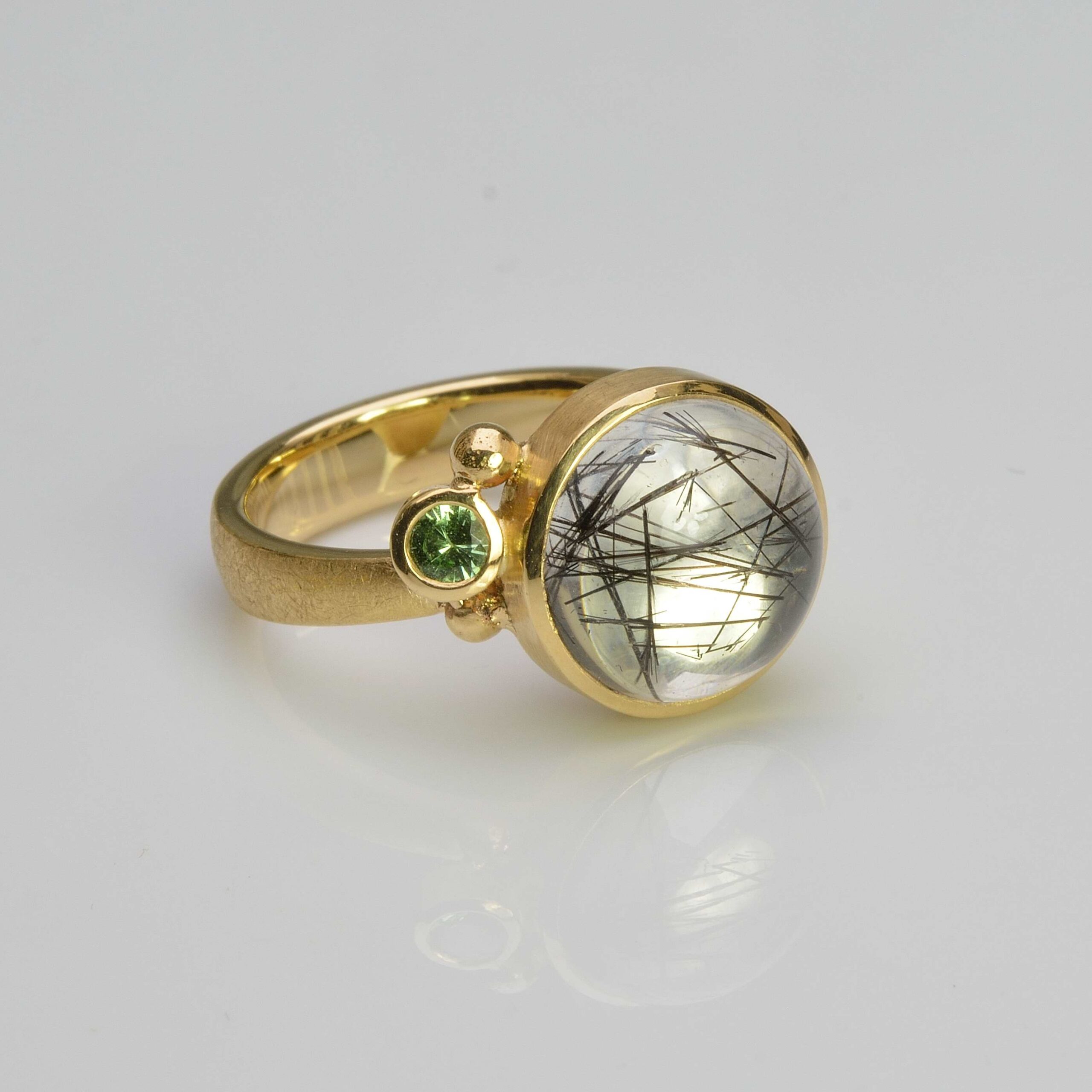 18ct yellow gold ring with a very clear 12mm round tourmalated quartz cabochon, partnered with a 3mm round faceted tsavorite green garnet and decorative gold balls.  Set onto a matt finish tapered gold shank measuring 4.5mm wide at the base and 2.4mm at the shoulders and 1.8mm thick.  Birmingham Assay hallmark.