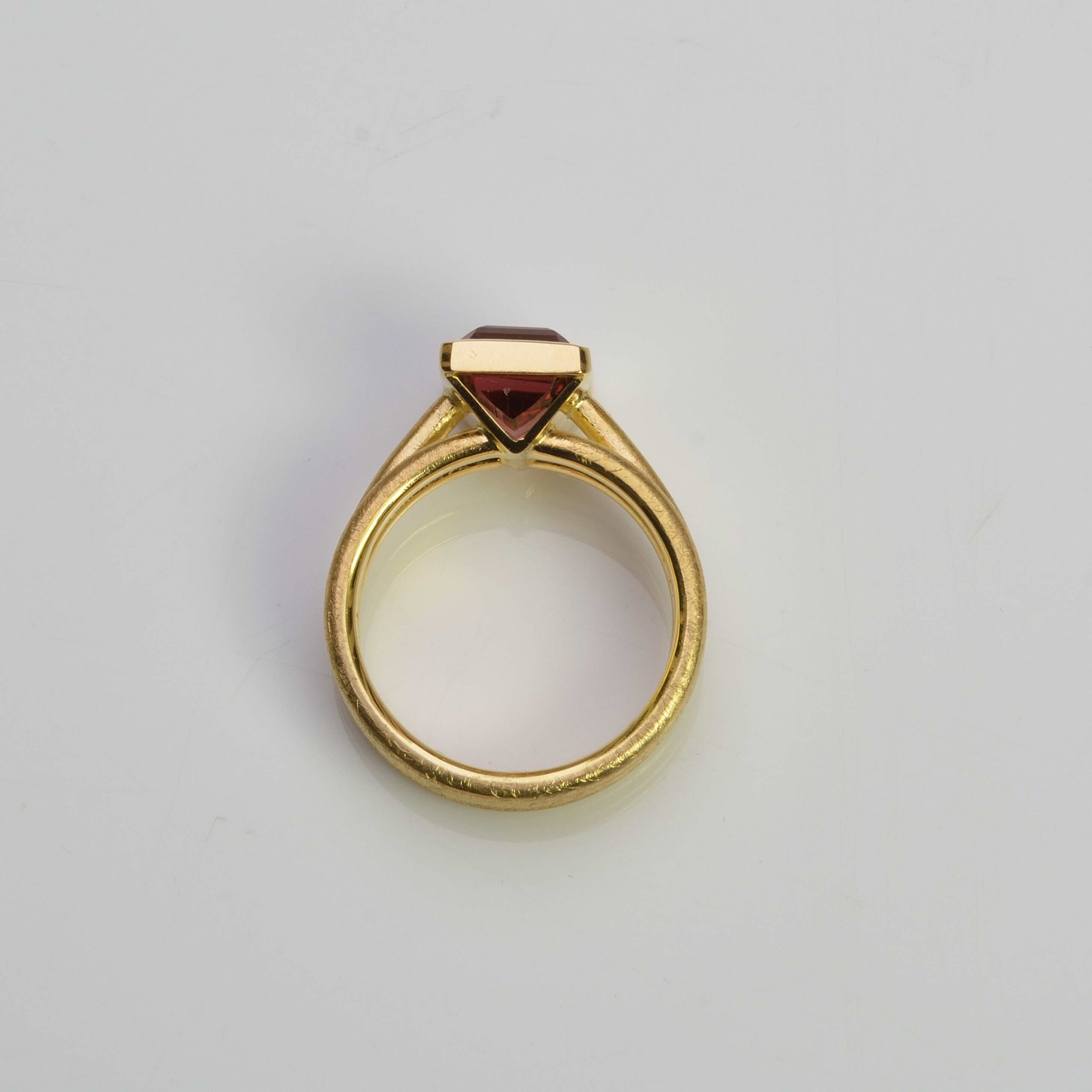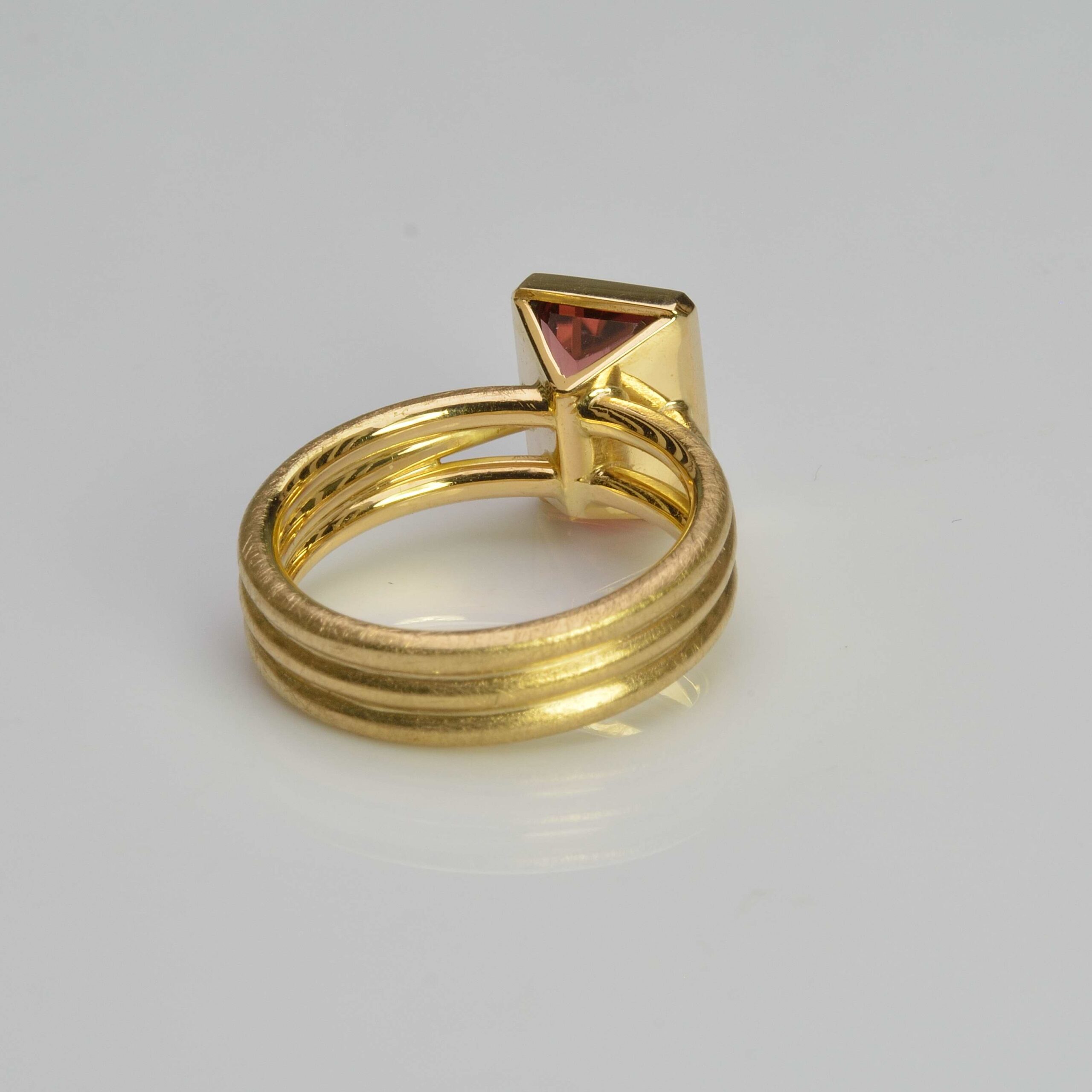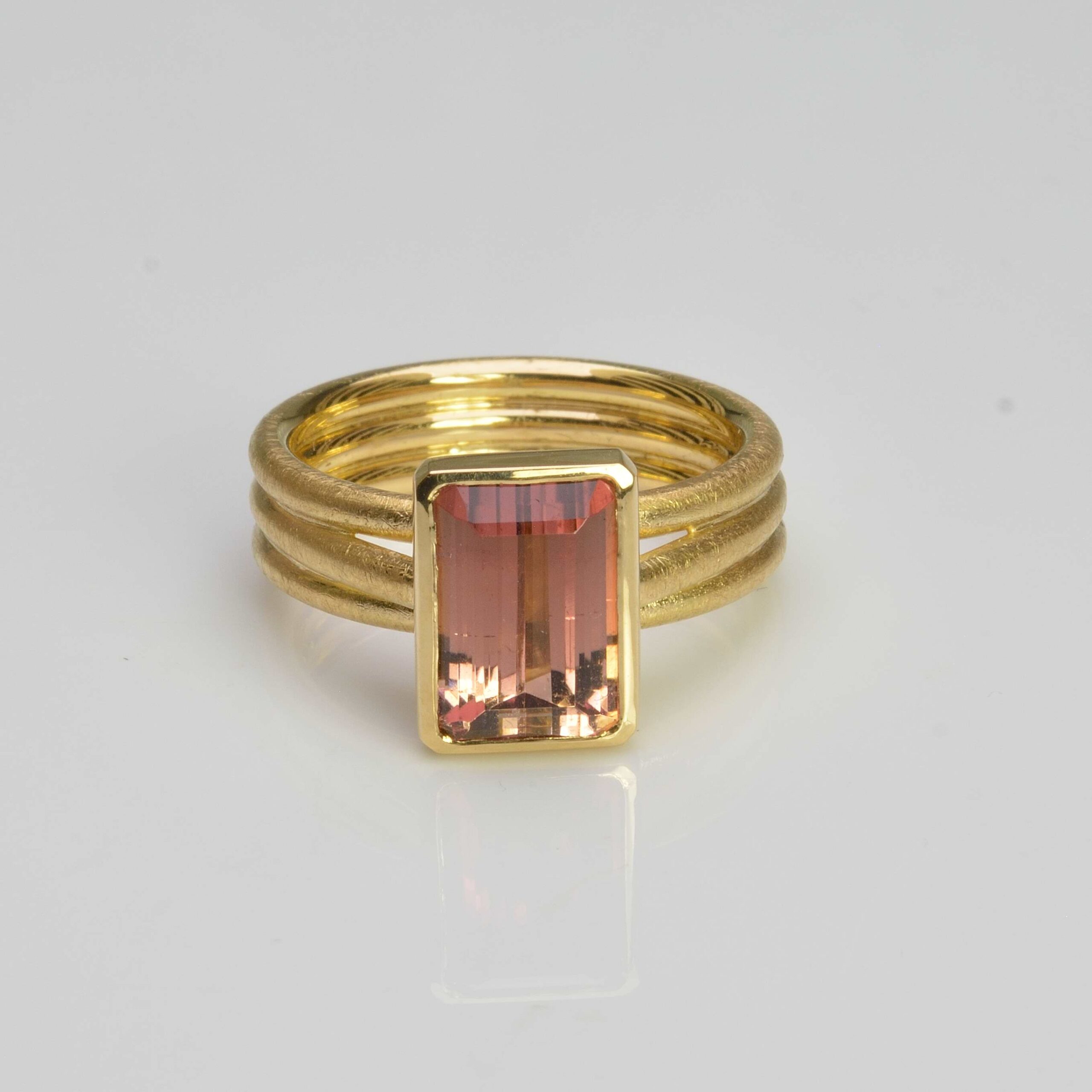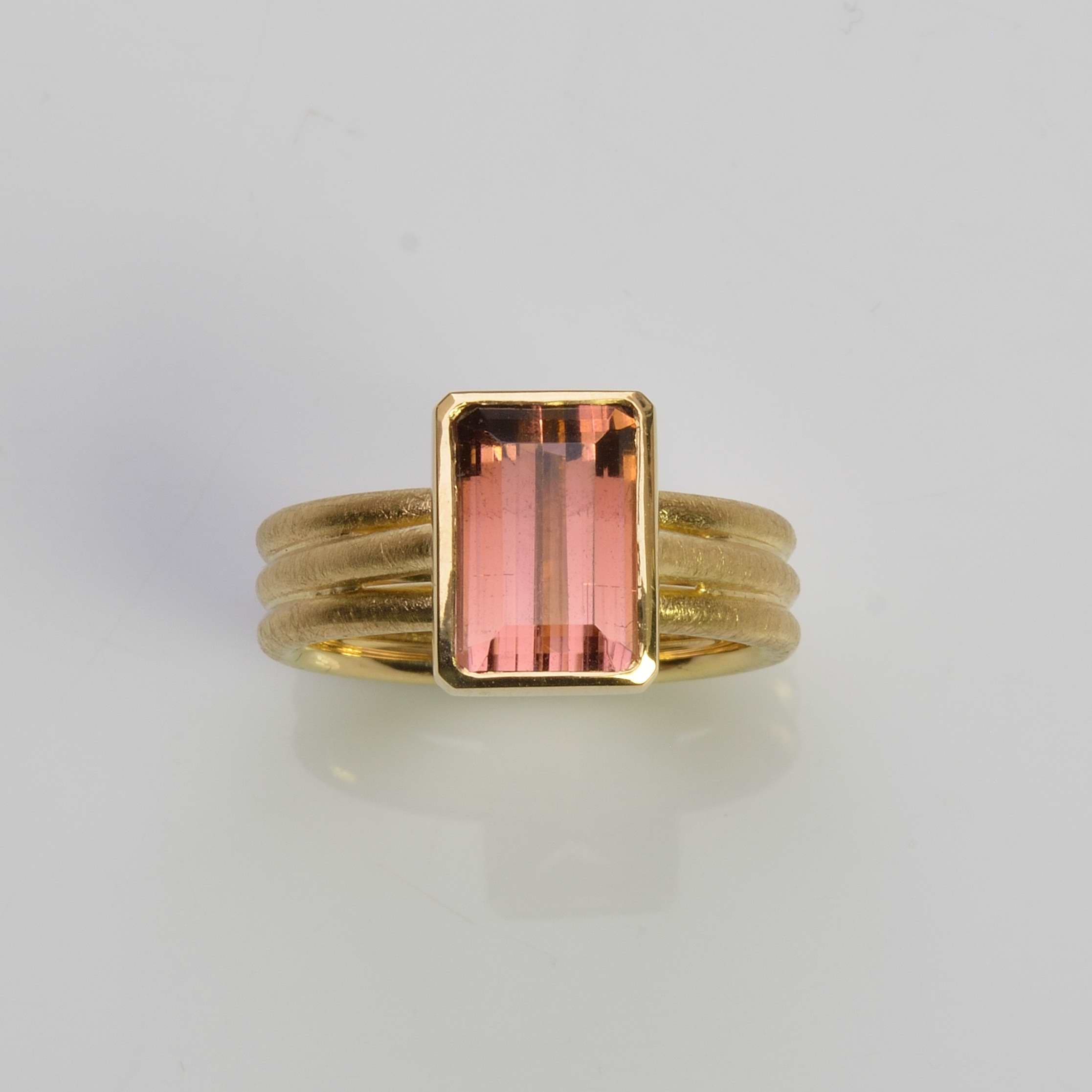 Stunning faceted pink tourmaline measuring 10.5mm x 7.5mm. Handmade in 18ct yellow gold comprising three combined round profile rings with a matt finish. The ring measures 5.6mm in width and is 1.9mm thick. Hallmarked by the Birmingham Assay office.