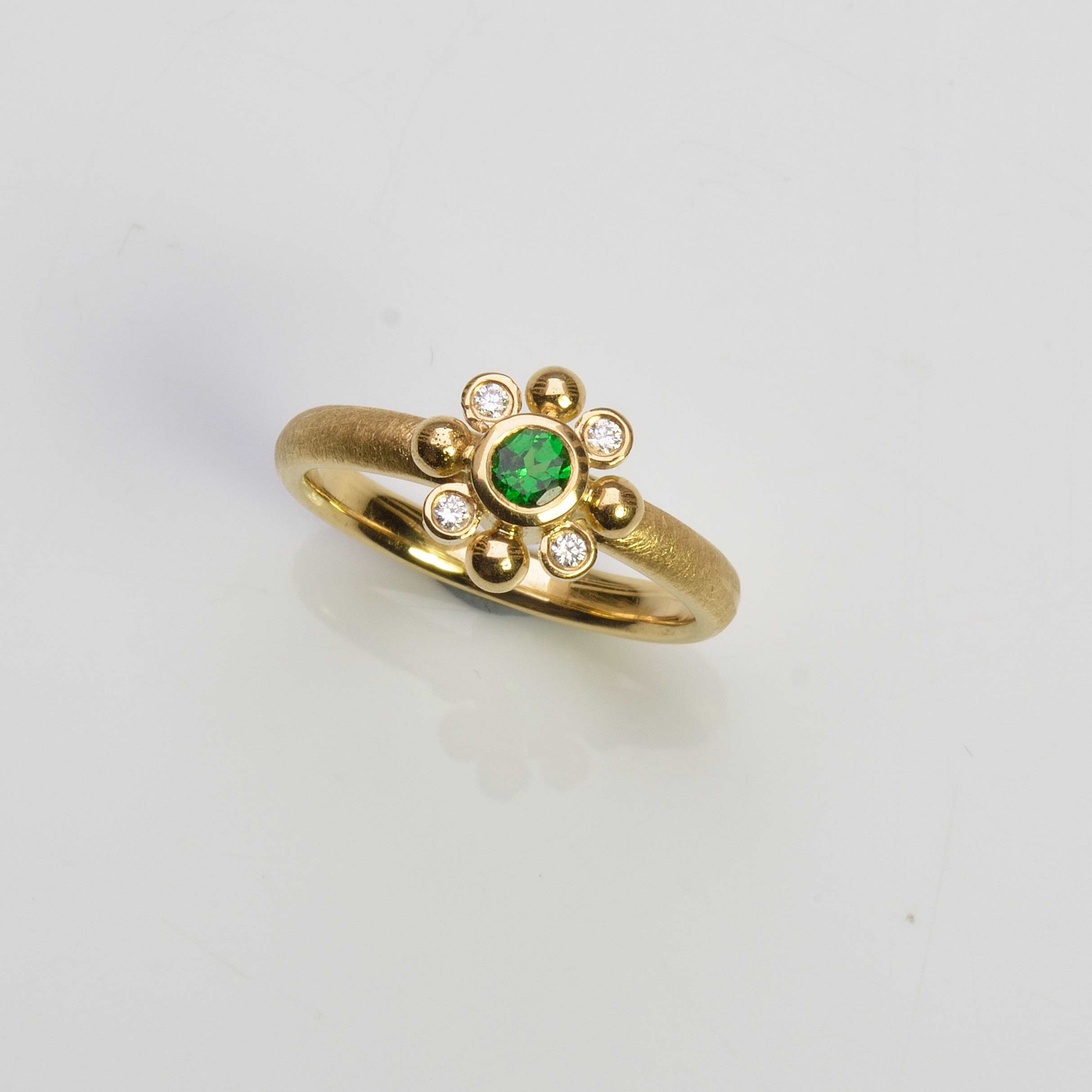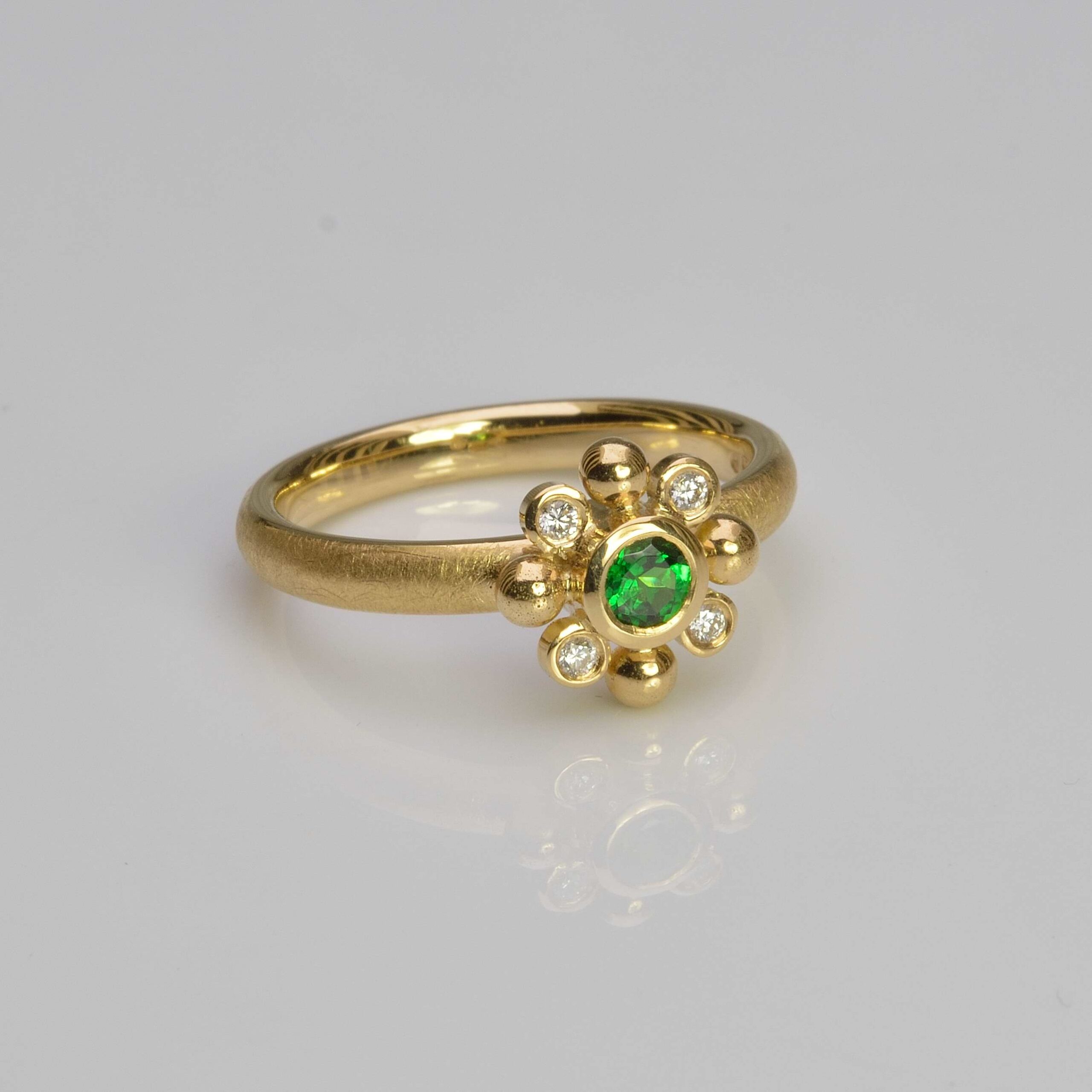 18ct yellow gold ring with a vibrant 4mm round faceted tsavorite green garnet and four 1.8mm round brilliant cut natural diamonds (G/Si).  The matt finished ring shank measures 2.75mm wide and 1.8mm thick.  Birmingham Assay hallmarked.