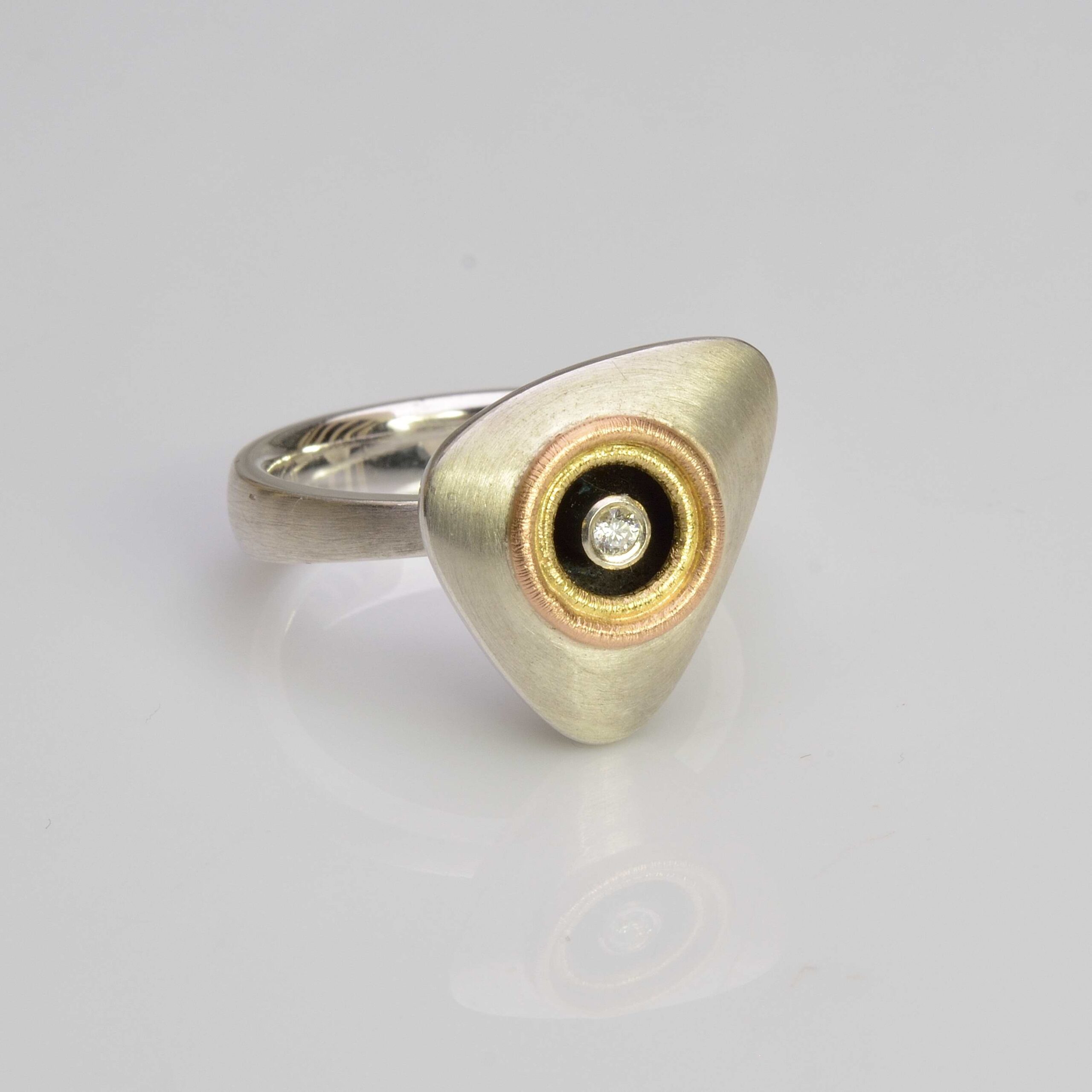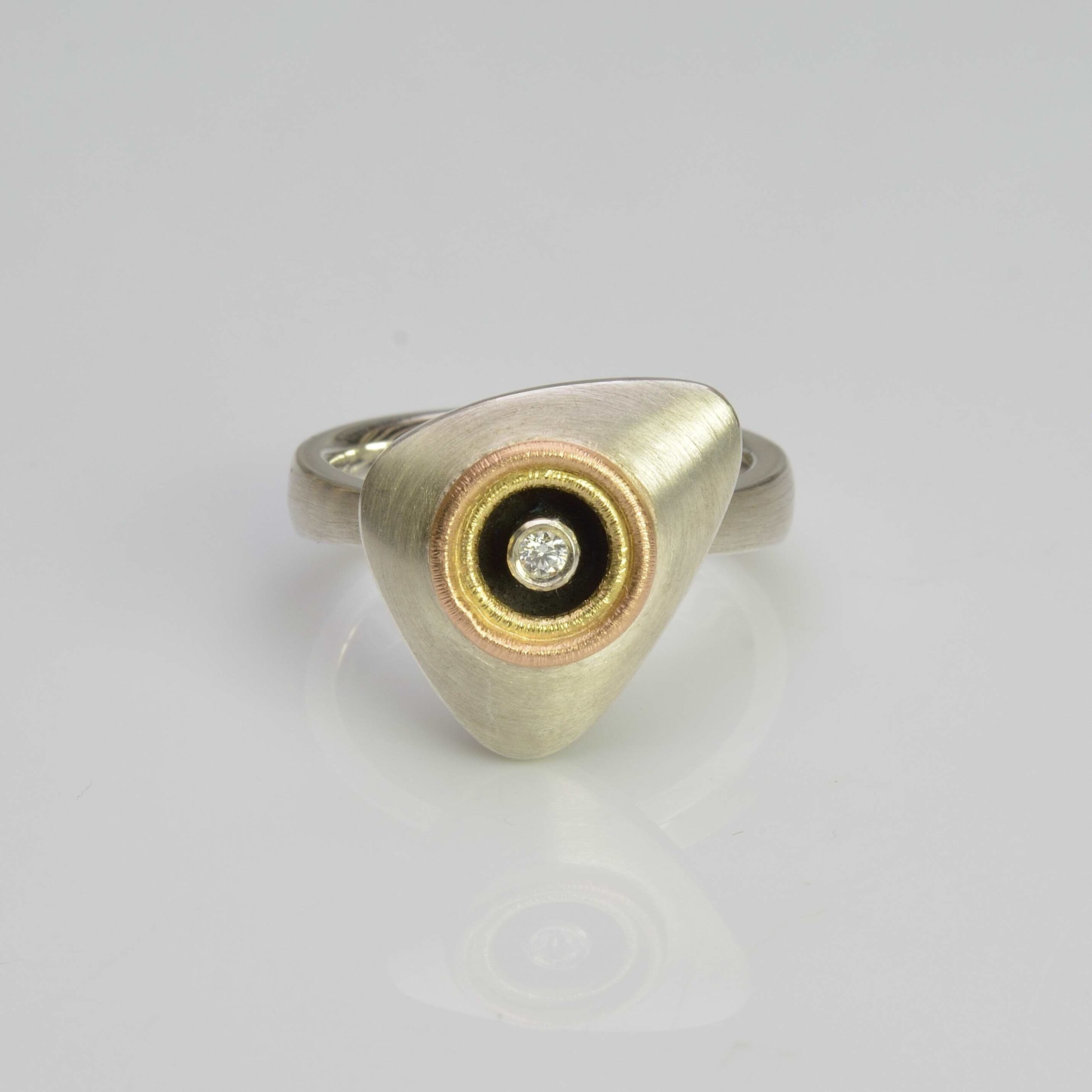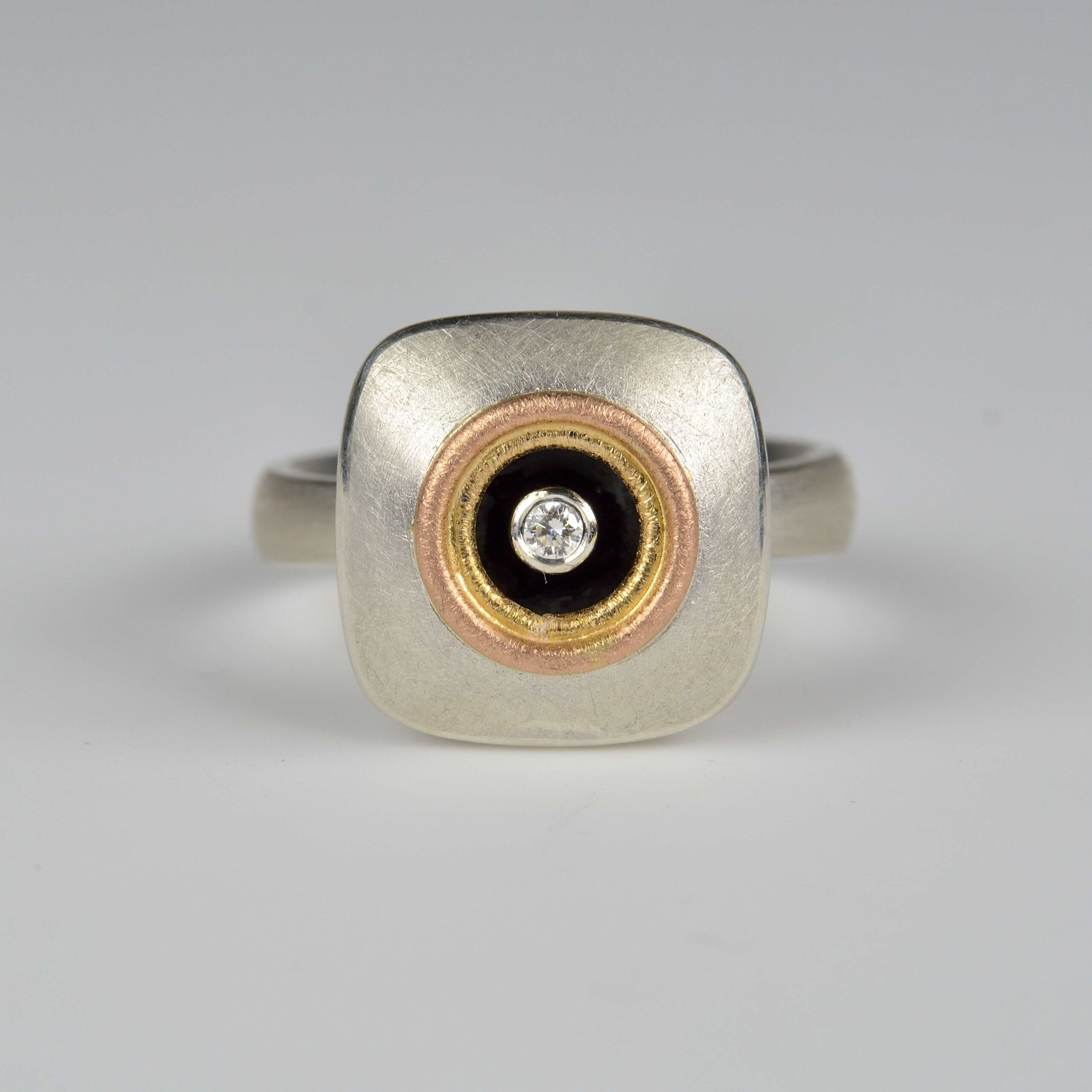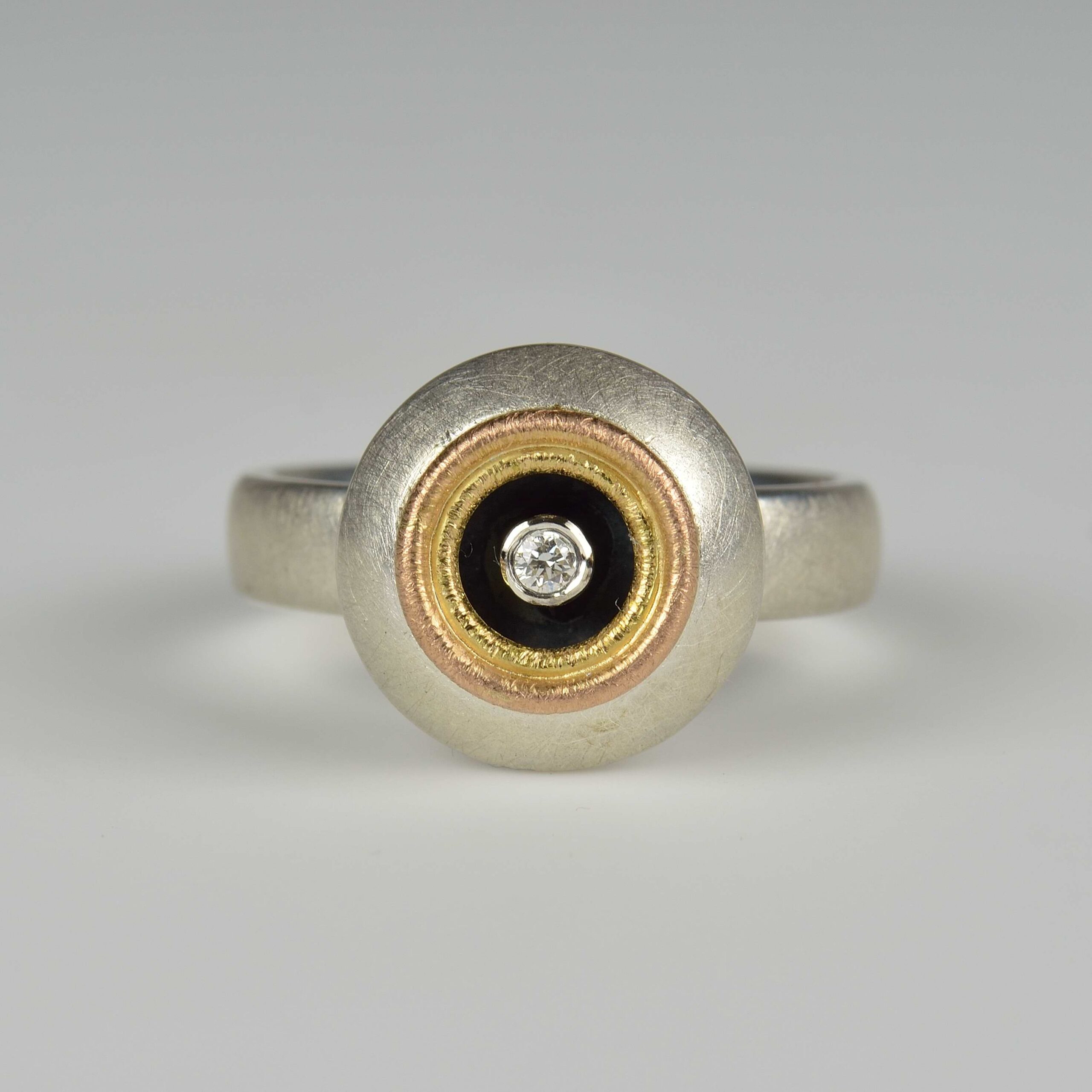 Sterling silver ring with a central hollow mount edged with stepped 18ct red and yellow solid gold rings. The silver inside the dome is oxidised, which beautifully frames the bezel set with a 0.03ct brilliant cut diamond and gives it a floating appearance. The central mounts measures approximately 13mm across. The ring mount can be made in various shapes including round, cushion and triangular.