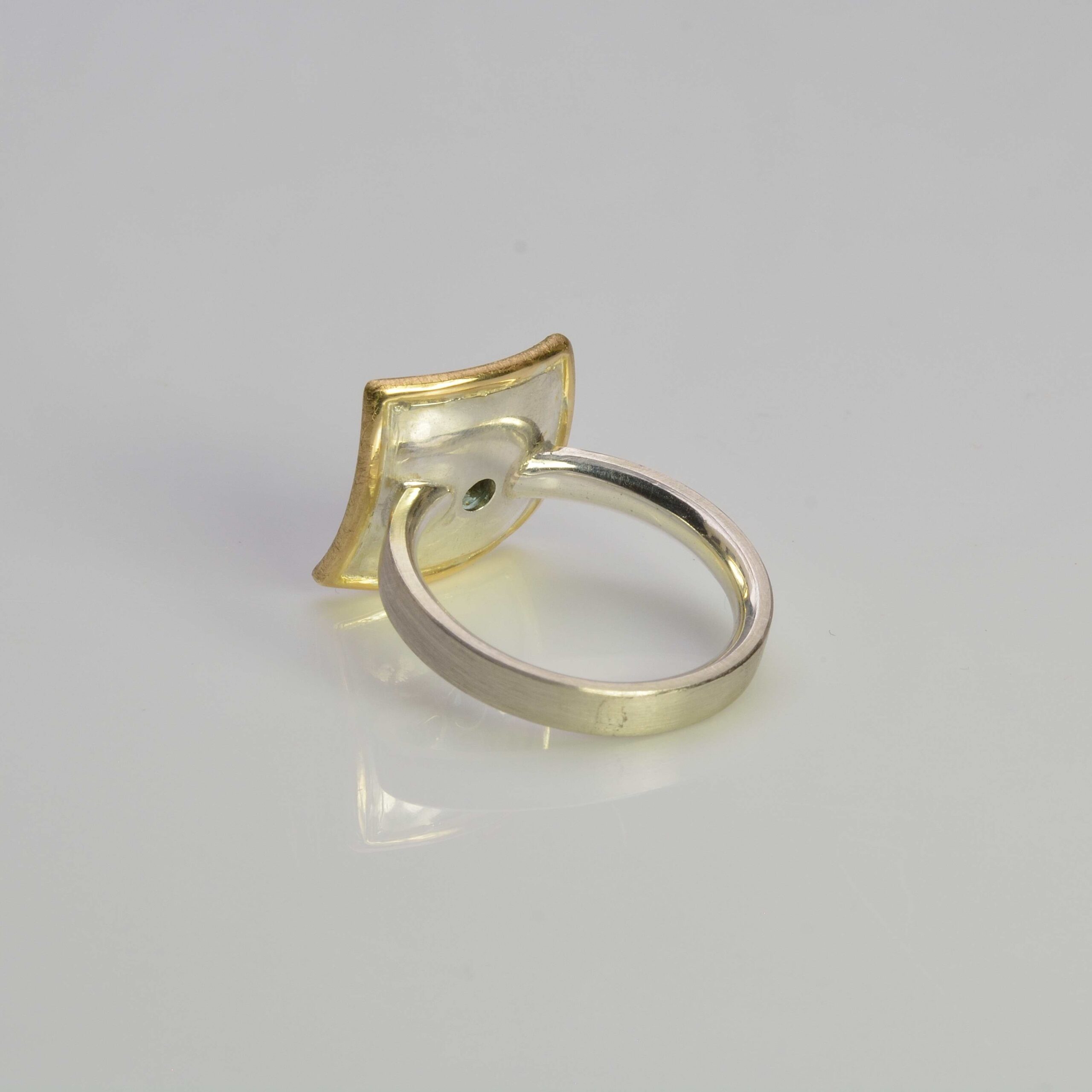Sterling silver ring with a 15mm square concave sheet fused with embedded strips of finegold and bordered with 1.4mm 18ct yellow gold round wire.  The 4mm square faceted blue green tourmaline is set in 18ct yellow gold.  The flat court shape ring shank is 3mm wide and 1.9mm thick.