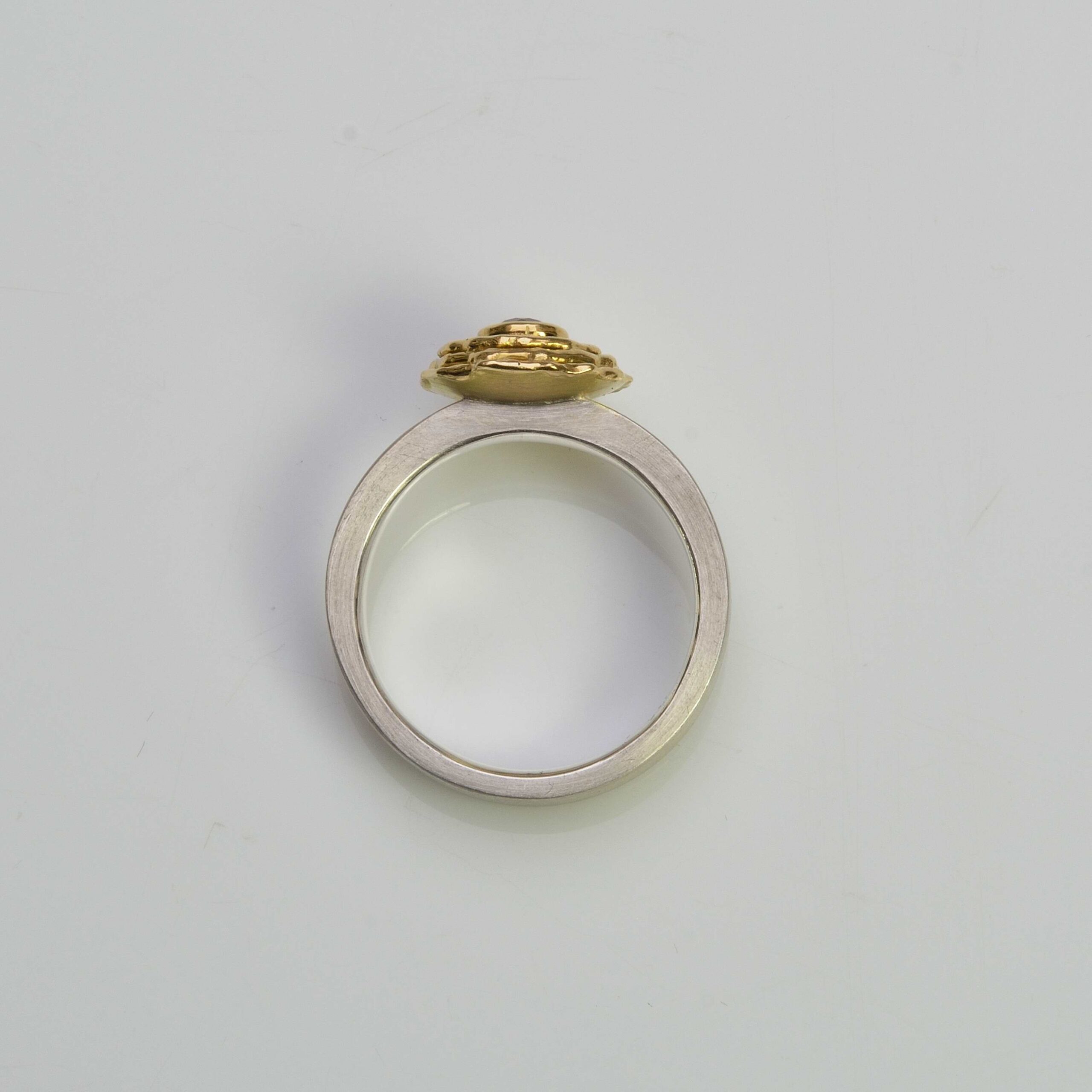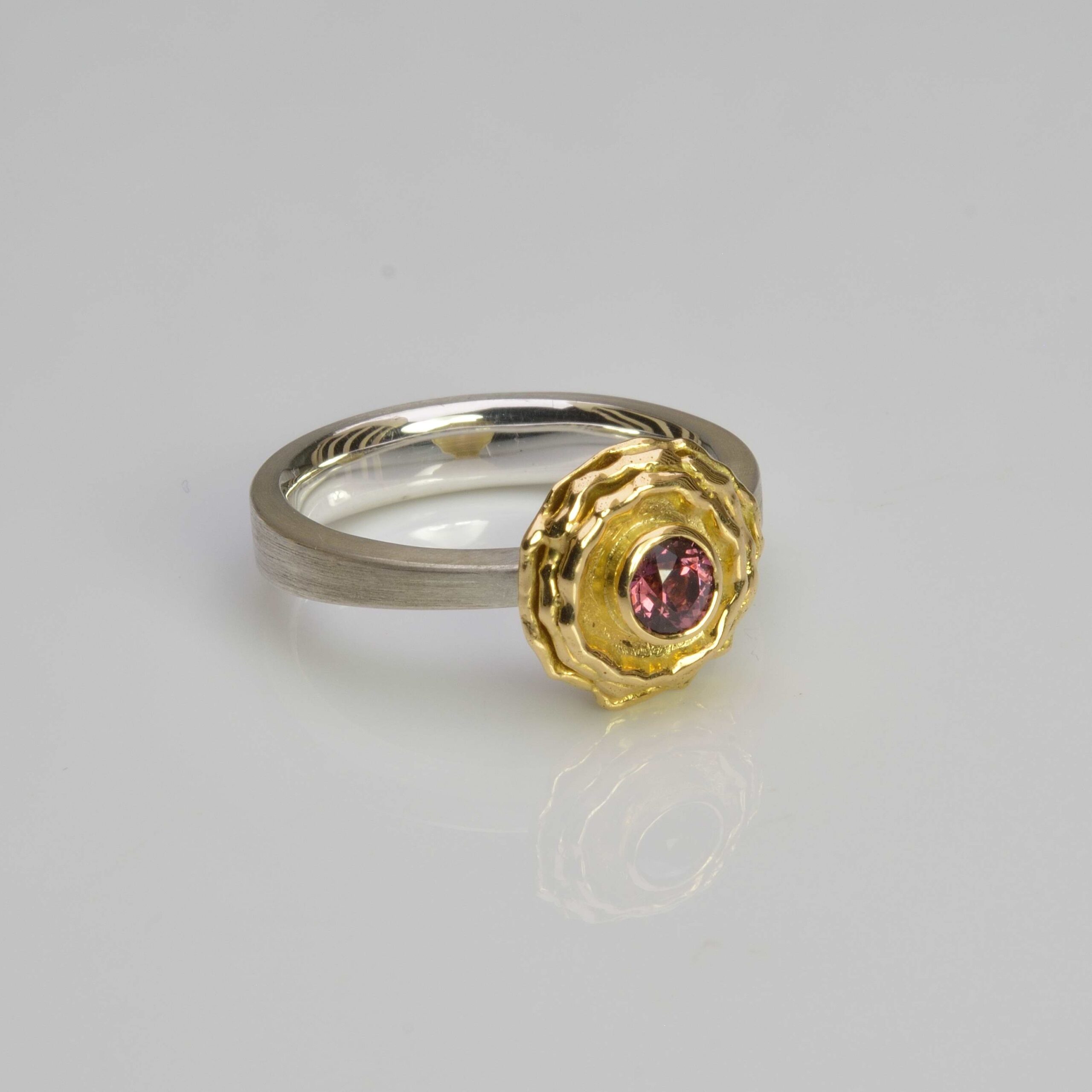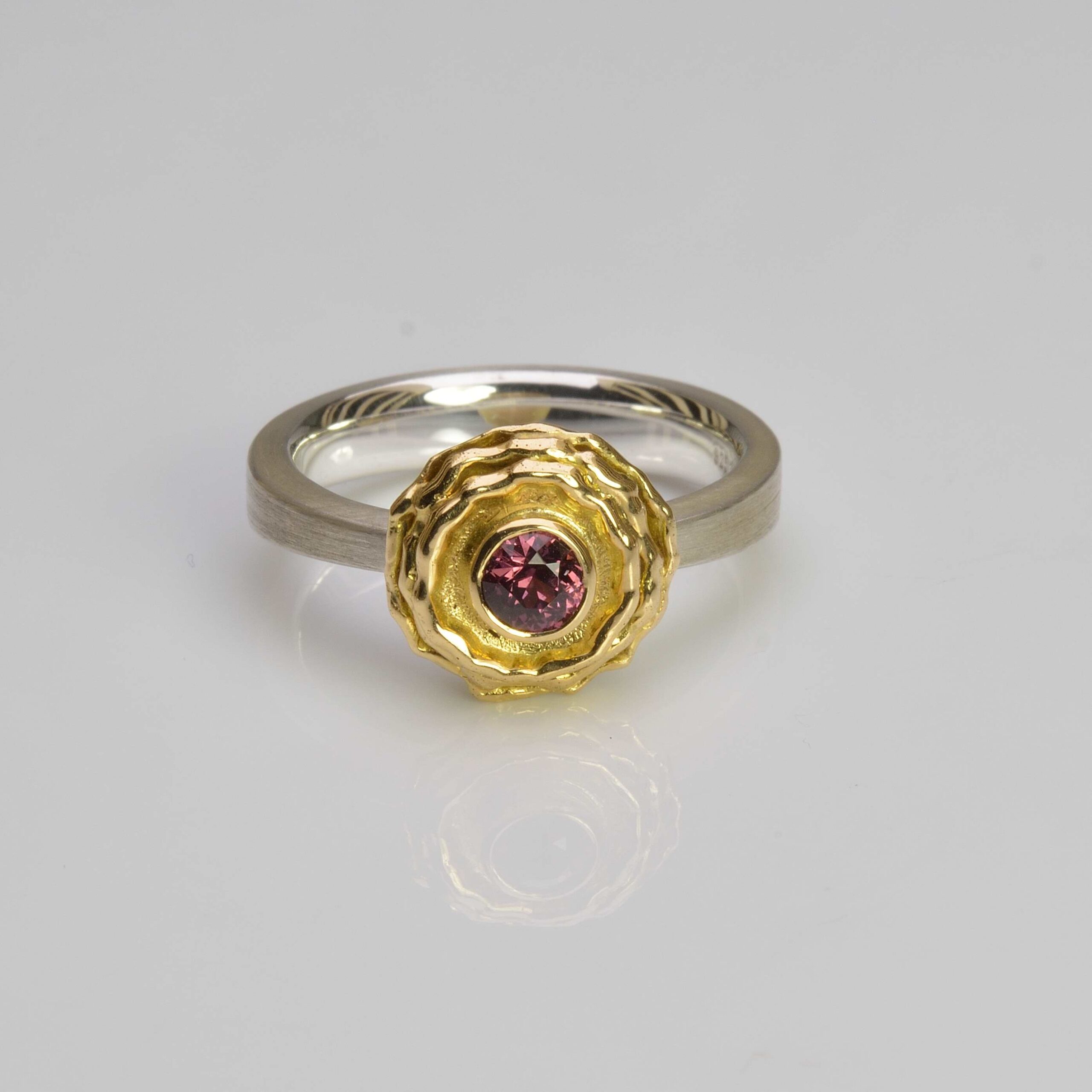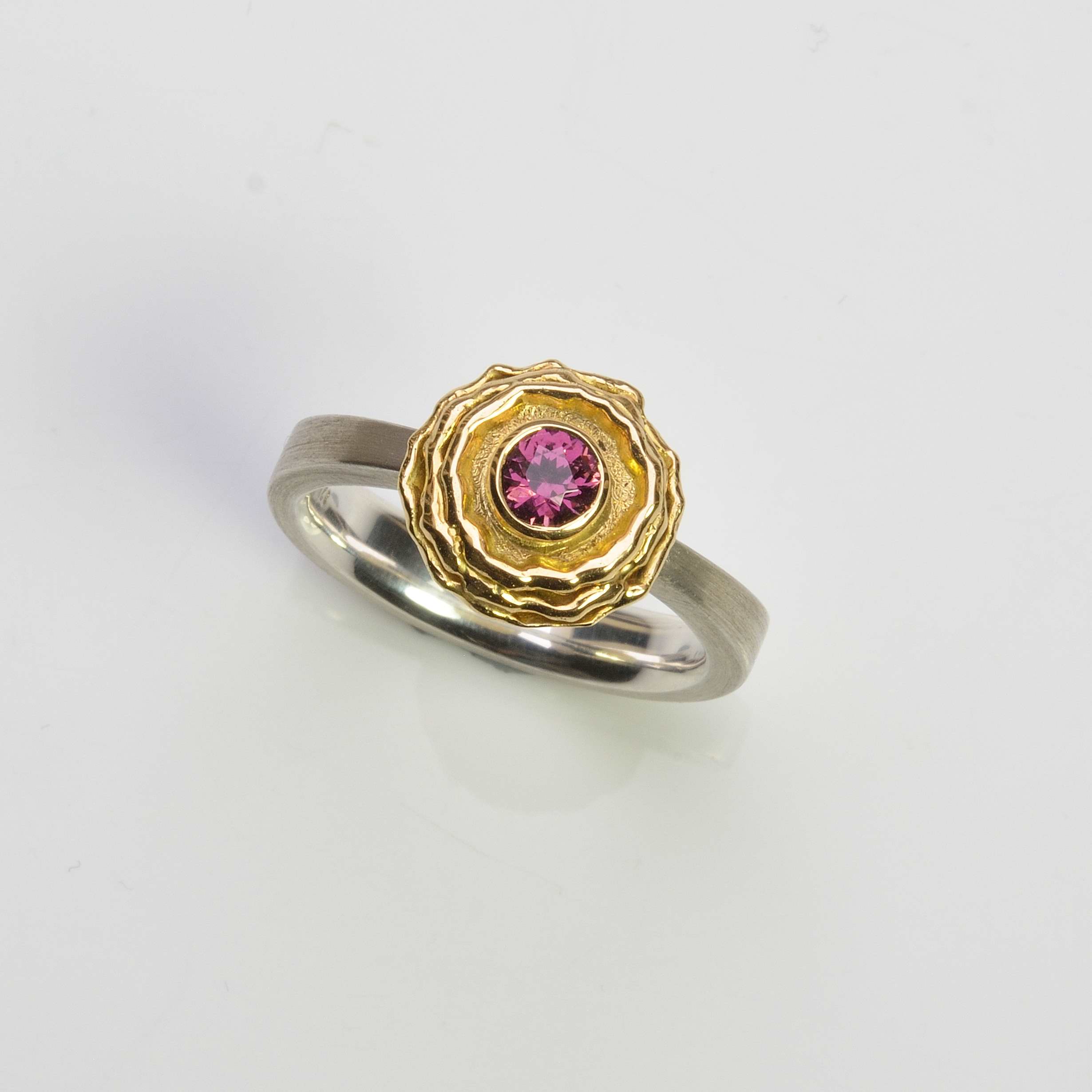 Sterling silver ring with 4.5mm round faceted rhodolite garnet set into a series of 18ct gold shallow bowls with high polish fused edges.  The flat profile fine matt silver shank tapers to 2.2mm at the shoulders and widens to 4.3mm at it’s base.