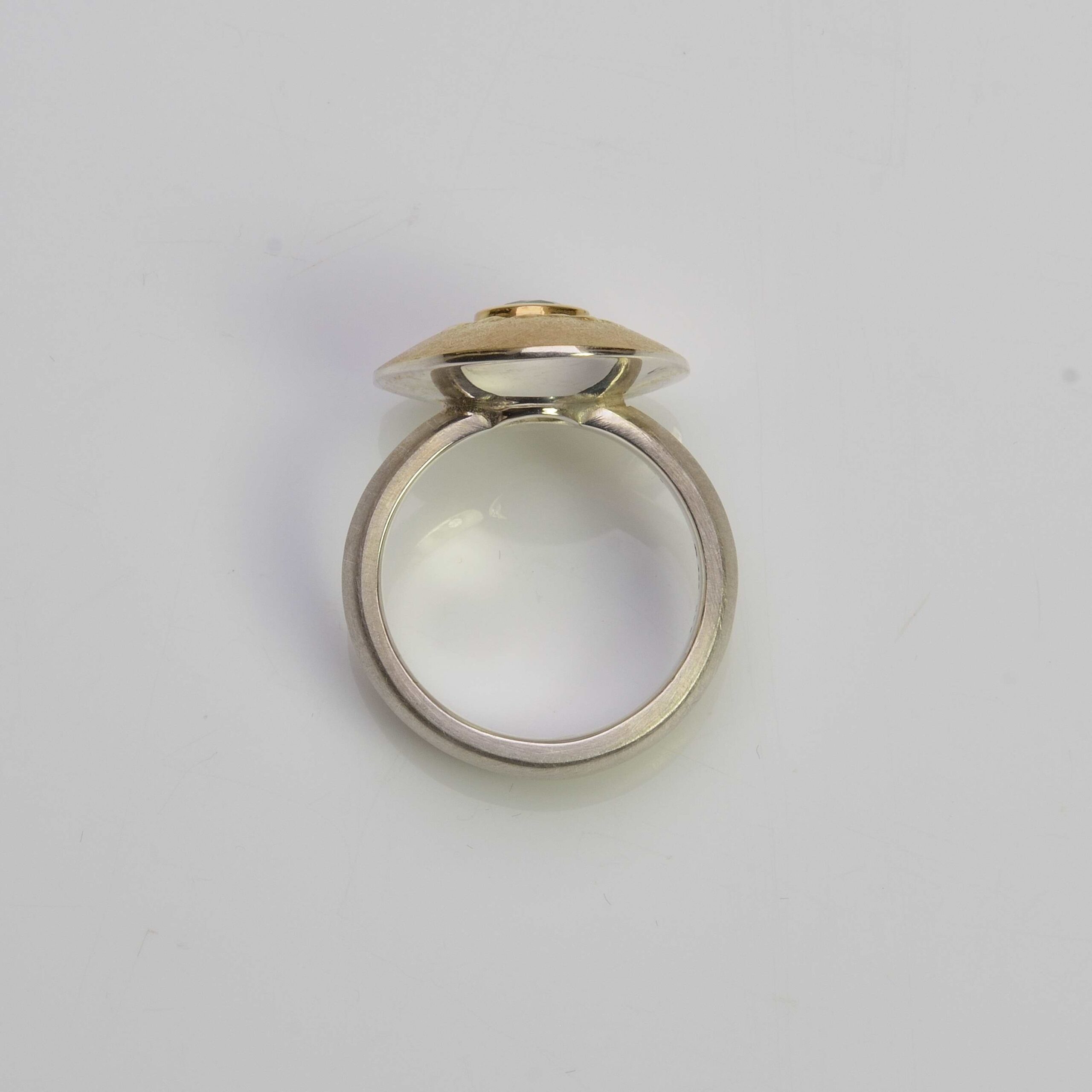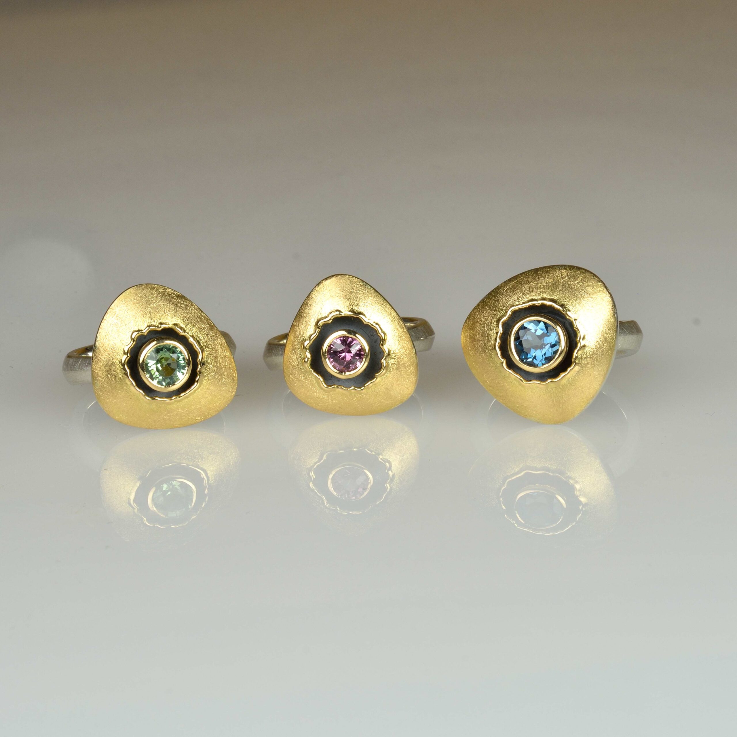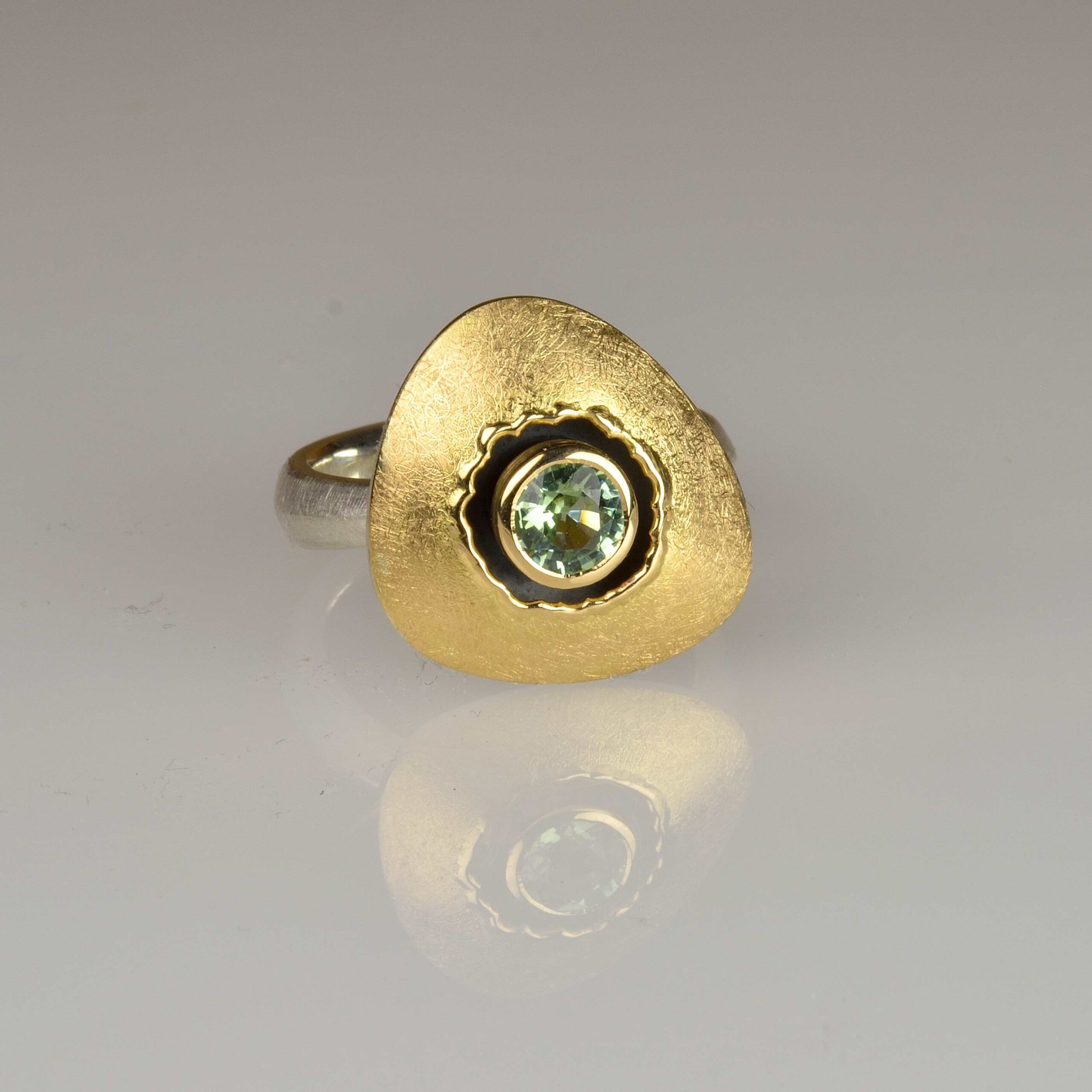 Sterling silver shank ring with a fresh, bright green 6mm round faceted tourmaline set in 18ct yellow gold. The top face of the ring is made from 18ct gold with a fused edge. This forms a hollow bowl with an oxidised silver lower section. The black oxidised inner bowl contrasts with the bright gem, beautifully framing it. The asymmetrical three cornered bowl measures 19mm at its widest point. The sterling silver shank tapers towards the bowl, measuring 5.3mm at the bottom and 3mm at the top and has a thickness of 2.4mm. A statement ring with a tactile feel that can be worn everyday.